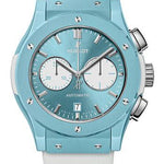 45 mm polished and satin finished blue ceramic case, polished blue ceramic back engraved CAPRI EDITION, polished and satin finished blue ceramic bezel, sapphire crystal, blue sunray satin-finished dial with white counter, HUB1143 self-winding movement with chronograph, approximately 42 hours of power reserve, white lined rubber strap. Water resistant to 50 meters.
