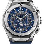 45 mm polished titanium case, polished titanium bezel with 6 H-shaped titanium screws, sapphire crystal with anti-reflective treatment, sapphire crystal dial, HUB1155 self-winding skeleton chronograph movement, approximately 42 hours of power reserve, blue smooth rubber strap, stainless steel deployant buckle. Water resistant to 50m (5 ATM).