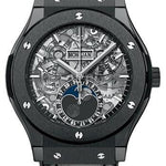 45 mm polished and satin-finished black ceramic case, polished and satin-finished black ceramic bezel with 6 H-shaped titanium screws, sapphire crystal with anti-reflective treatment, sapphire dial with polished rhodium-plated appliques and hands, HUB1131 self-winding movement with Moon Phase movement, approximately 42 hours of power reserve, black rubber and alligator strap, black PVD stainless steel deployant buckle. Water resistant to 50 meters.