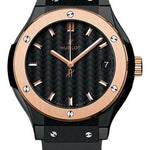 33 mm satin finished and polished black ceramic case, satin-finished and polished 18K king gold bezel, sapphire crystal with anti-reflective treatment, black dial with mat carbon fiber, HUB2912 quartz movement, approximately 3 to 5 years of power reserve, black lined rubber strap, 18K red gold deployant buckle. Water resistant to 50 meters.