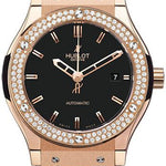 42mm 18K red gold case, 18K red gold bezel set with 138 diamonds (1.12ct), black composite resin lateral inserts and bezel lugs, mat black dial, self winding HUB 1110 movement, approximately 42 hours of power reserve, black rubber and alligator strap with deployant buckle. Water resistant to 50 meters.