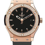 42mm 18K red gold case, 18K red gold bezel set with 138 diamonds (0.89ct), black dial, self winding HUB 1110 movement, approximately 42 hours of power reserve, black rubber strap with deployant buckle. Water resistant to 50 meters.