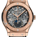 42 mm polished and satin-finished 18K King Gold case, polished and satin-finished 18K King Gold bezel with 6 h-shaped titanium screws, sapphire crystal with anti-reflective treatment, sapphire dial, HUB 1131 self-winding movement with moonphase, approximately 42 hours of power reserve, black alligator strap, 18K red gold and black-plated stainless steel deployant buckle. Water resistant to 50 m.
