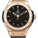 33mm 18K King gold case, 18K King gold bezel, black composite resin lateral inserts and bezel lugs, mat black dial, quartz HUB 2912 movement, black rubber strap with deployant buckle. Water resistant to 50 meters.
