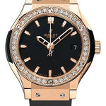 33mm 18K King gold case, 18K King gold bezel set with 36 diamonds (0.75ct), black composite resin lateral inserts and bezel lugs, mat black dial, quartz HUB 2912 movement, black rubber strap with deployant buckle. Water resistant to 50 meters.