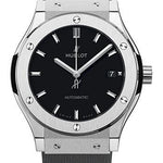 42mm polished and satin-finished titanium case, vertical satin-finished titanium bezel with 6 h-shaped titanium screws, sapphire crystal with anti-reflective treatment, mat black dial with satin-finished rhodium-plated appliques and polished rhodium-plated hands, HUB 1112 self-winding movement, approximately 42 hours of power reserve, black lined rubber strap, stainless steel deployant buckle. Water resistant to 50 m.