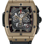 45 mm polished sapphire crystal case, polished sapphire crystal bezel with 6 h-shaped titanium screws, sapphire crystal with anti-reflective treatment, sapphire crystal dial, HUB4700 self-winding skeleton chronograph movement, approximately 50 hours of power reserve, black structured lined rubber strap, black ceramic and black-plated titanium deployant buckle. Water resistant to 50m (5 ATM).