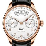 44.2 mm 18K red gold case, 15.3 mm thick, sapphire back, sapphire crystal with arched edge, antireflective coating on both sides, silver-plated dial, caliber 52850 pellaton automatic winding movement with power reserve display, annual calendar with displays for the date, day and month, small hacking seconds at 9 o’clock, approximately 7-day of power reserve, black alligator leather strap. Water resistant to 3 bar.