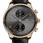 41.0 mm 18K 5N gold case, 13.0 mm thick, see-through sapphire glass back, convex sapphire glass crystal with antireflective coating on both sides, slate-coloured dial, calibre 69355 automatic movement with chronograph, column wheel, hours, minutes, small seconds, approximately 46 hours of power reserve, black alligator leather strap by santoni. Water resistant to 3 bar.