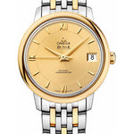32.7 mm stainless steel and yellow gold case, domed scratch-resistant sapphire crystal with anti-reflective treatment inside, champagne dial with Roman numerals and index hour markers, self-winding chronometer Omega 2500 movement with Co-Axial Escapement, approximately 48 hours of power reserve, stainless steel and yellow gold bracelet. Water resistant to 100 m.