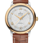 32.7 mm stainless steel and 18K yellow gold case, scratch-resistant sapphire crystal anti-reflective treatment inside, white silvery dial with a silk-like pattern and an opaline finish, Caliber Omega 2500 self winding movement with rhodium-plated finish, chronometer, date, approximately 48 hours of power reserve, light brown leather strap. Water resistant to 3 bar (30 metres / 100 feet).