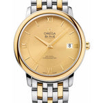 36.8 mm stainless steel and yellow gold case, domed scratch-resistant sapphire crystal with anti-reflective treatment inside, champagne dial with Roman numerals and index hour markers, self-winding chronometer Omega 2500 movement with Co-Axial Escapement, approximately 48 hours of power reserve, stainless steel and yellow gold bracelet. Water resistant to 100 m.