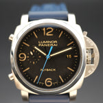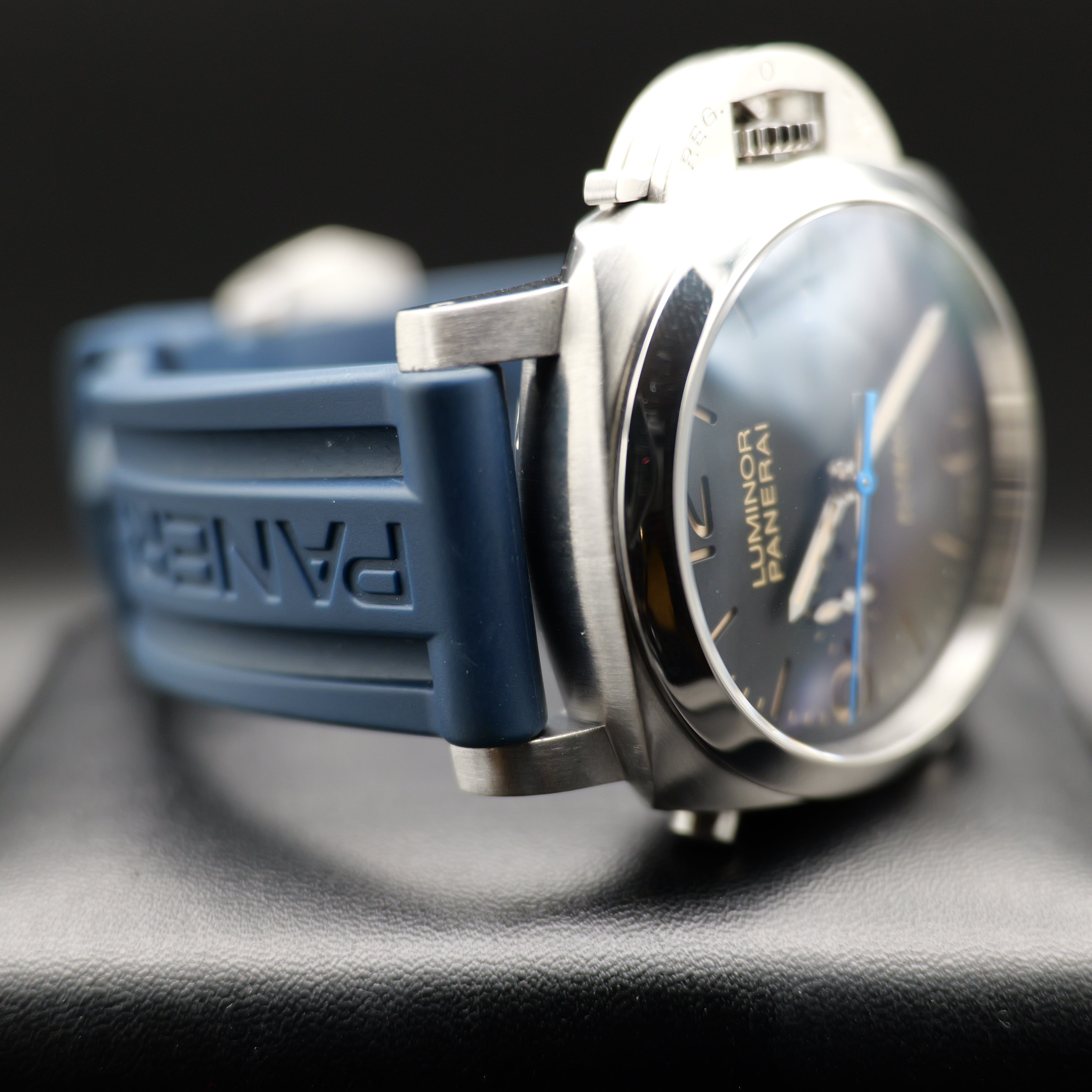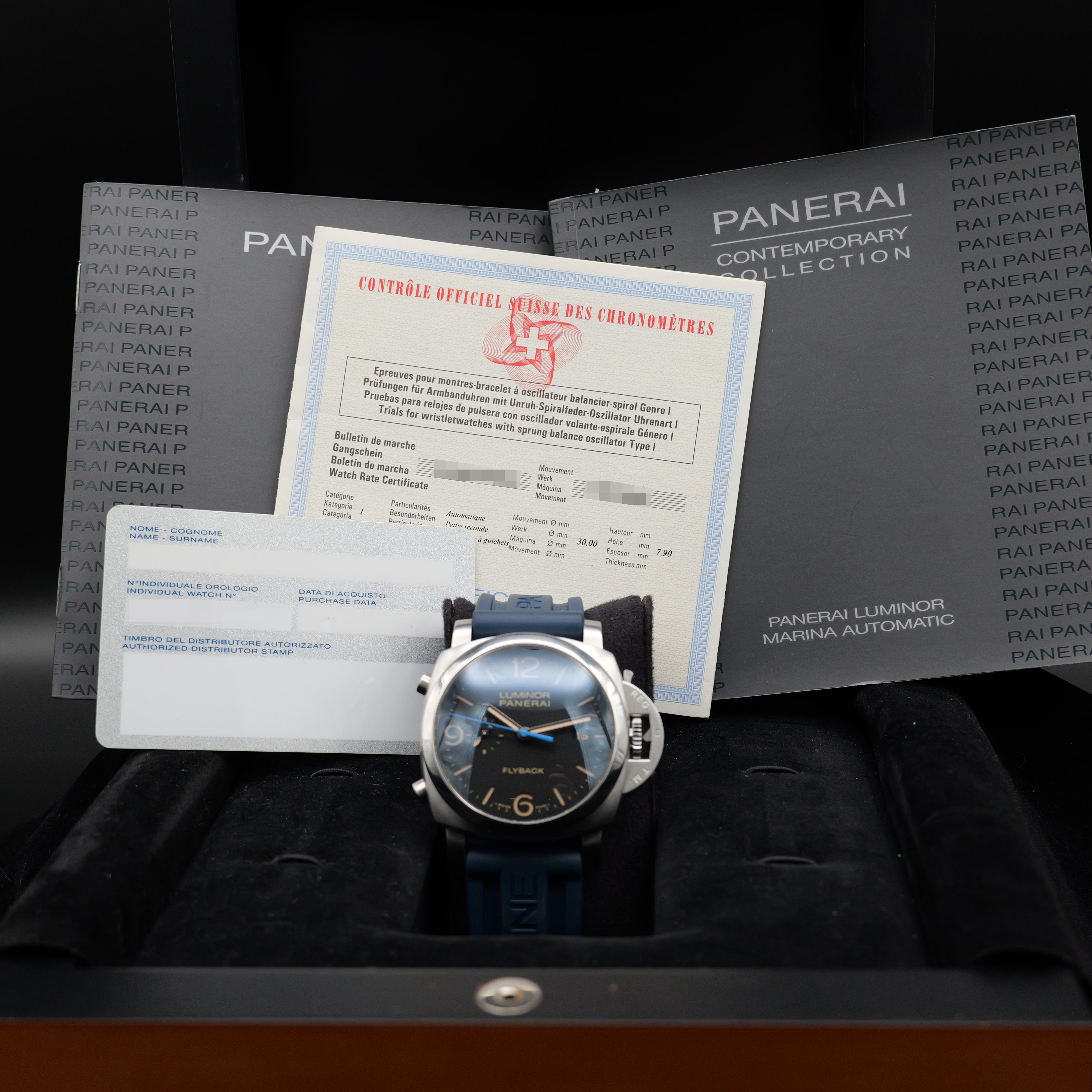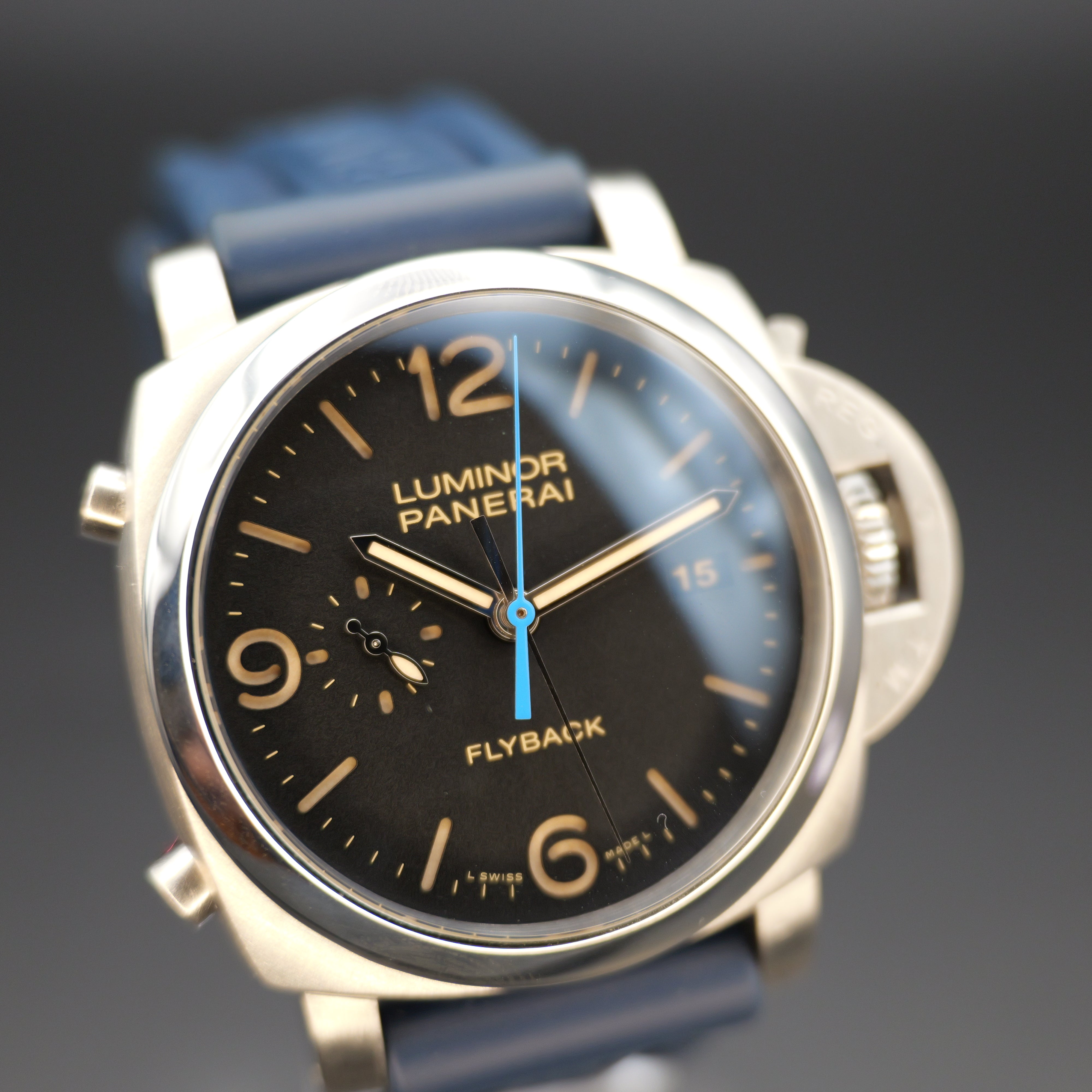 Up for sale is the Panerai Luminor 1950 3 Days Chrono Flyback PAM524 PAM00524 44MM Black Dial with an open warranty card, service booklet, chronometers testing papers, Panerai Guarantee Booklet, Panerai Contemporary collection booklet. MSRP $11200. It was recently placed on a timegrapher and is running well. All of our watches are photographed under high intensity light with a macro lens. Any flaws will be significantly magnified. The serial numbers have been blurred for privacy. Timepiece is in excellent condition showing minimal to no signs of wear. Timepiece is located in Indiana.