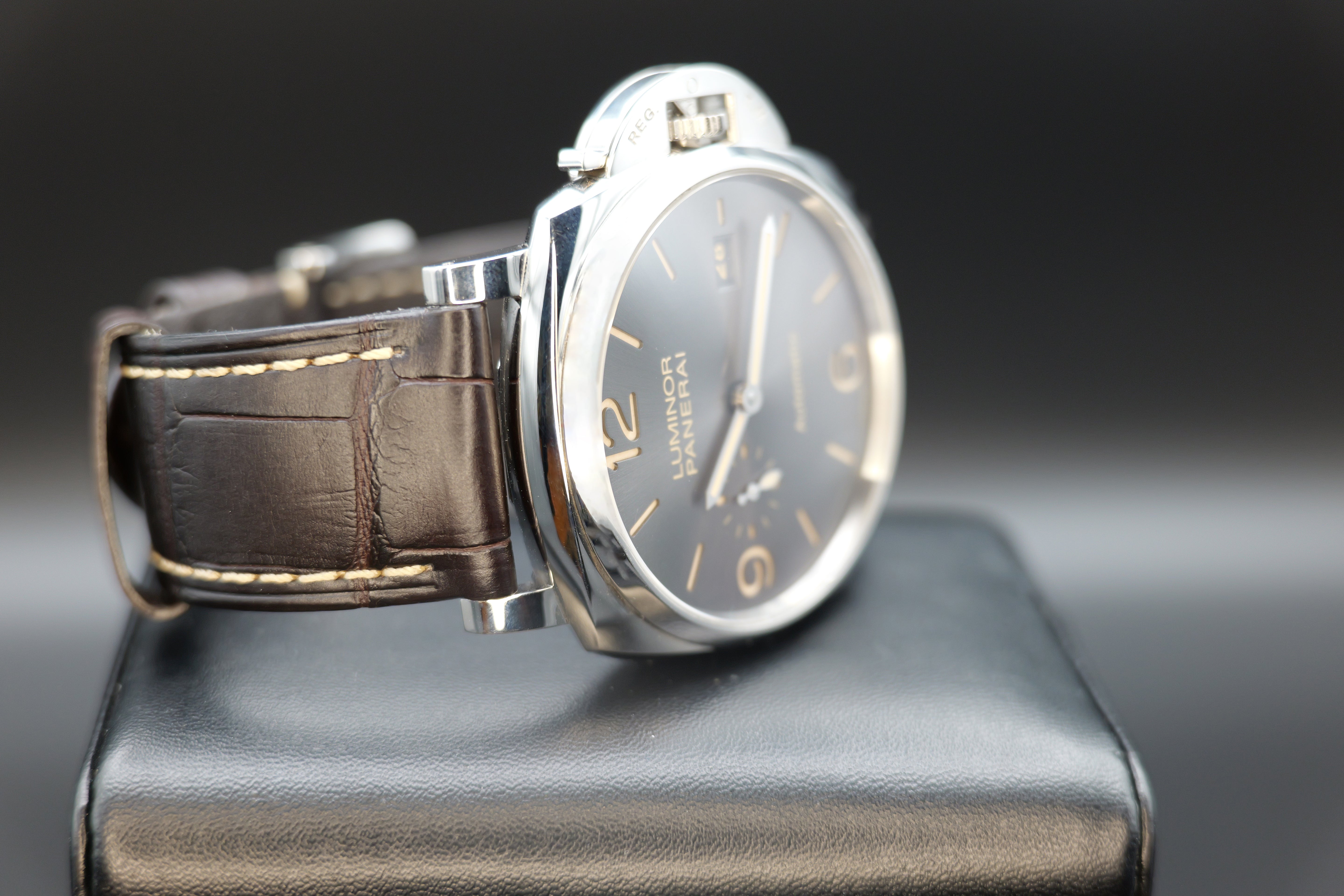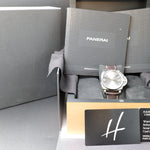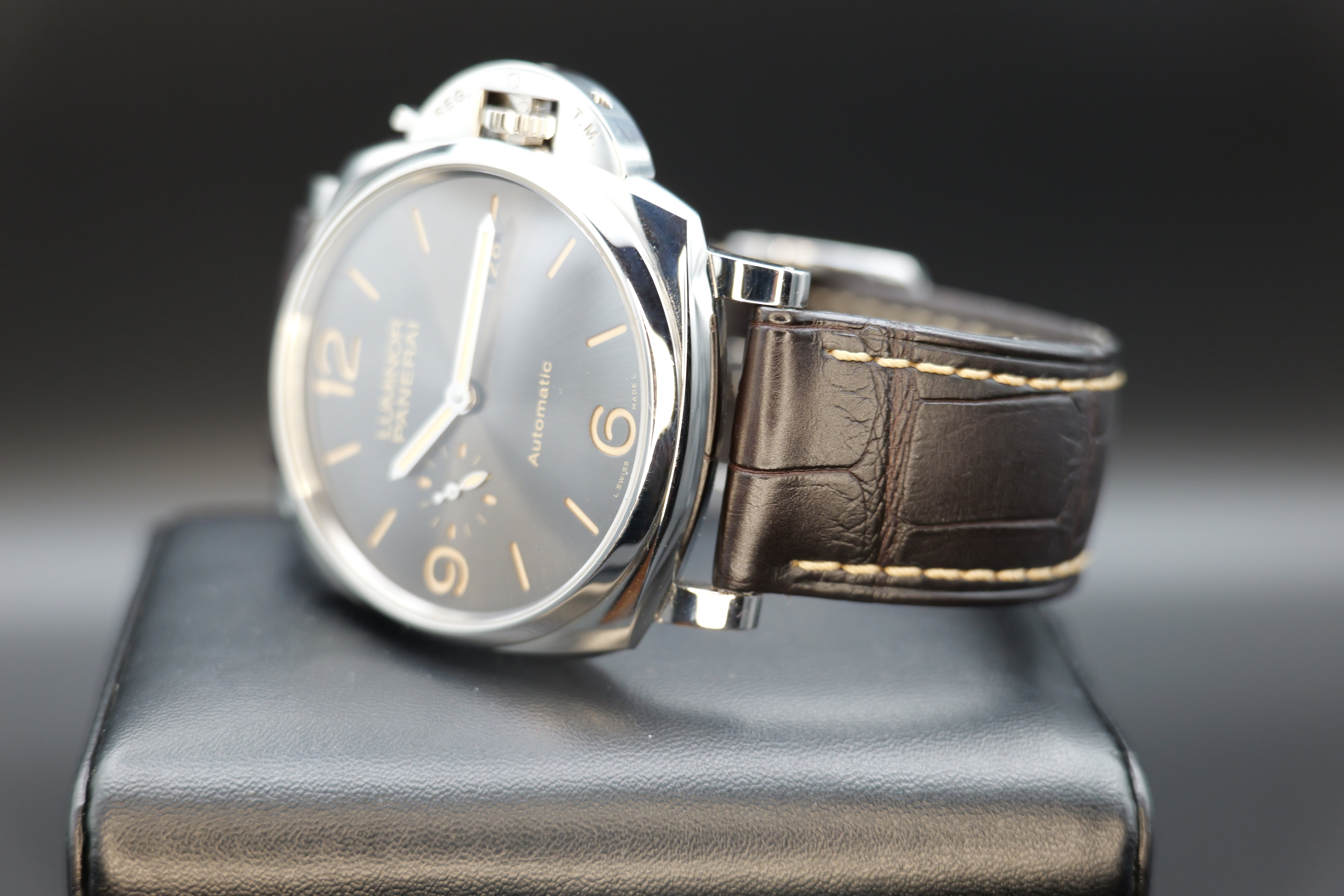 Up for sale is the Panerai Luminor Due PAM00943 PAM943 45MM Stainless Steel Grey Dial with third party authentication cards, Panerai tag, Panerai sticker tags, Panerai Certificate booklet, Panerai Instructions booklet, double boxed. MSRP $10,200. It was recently placed on a timegrapher and is running well. All of our watches are photographed under high intensity light with a macro lens. Any flaws will be significantly magnified. The serial numbers have been blurred for privacy.Timepiece is in excellent condition showing very minor signs of wear around the lugs. Timepiece is located in Indiana