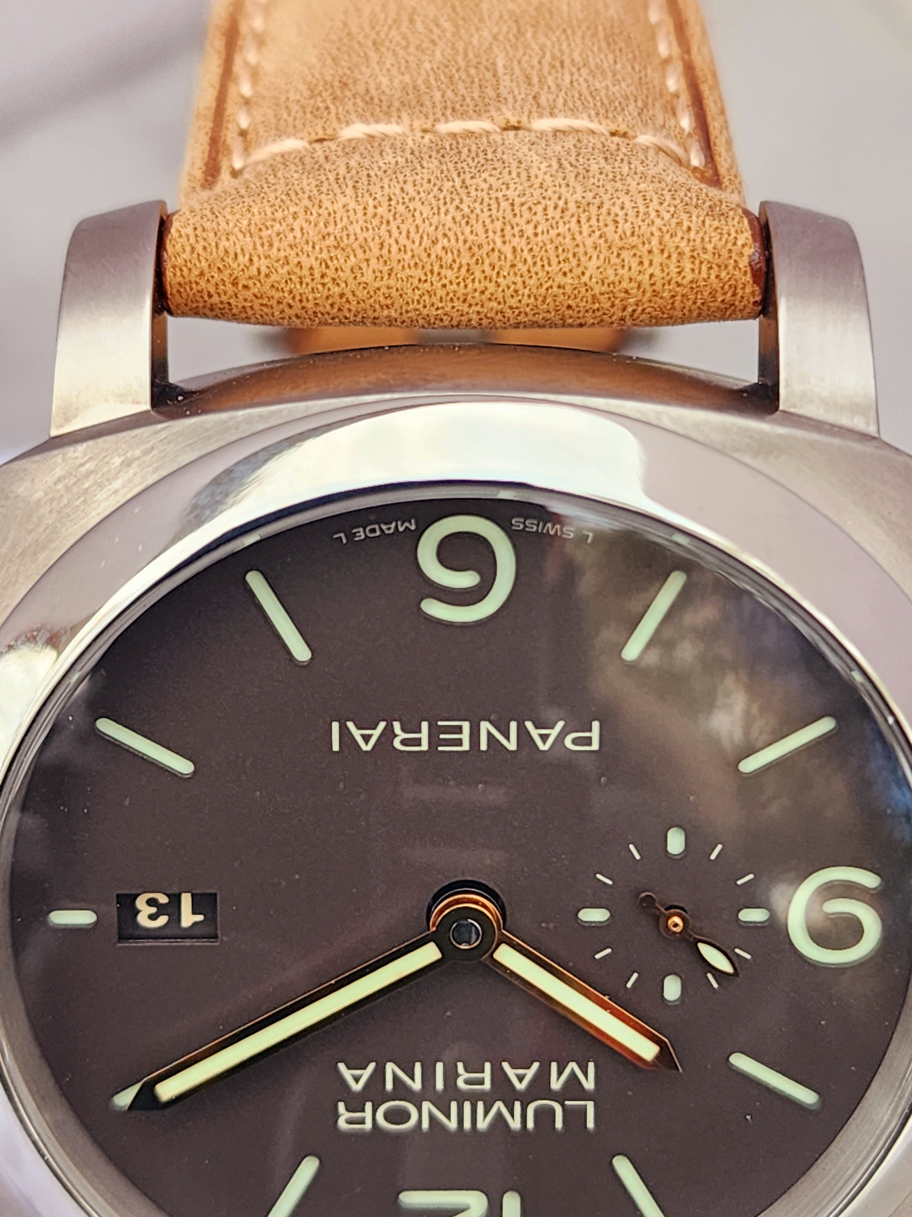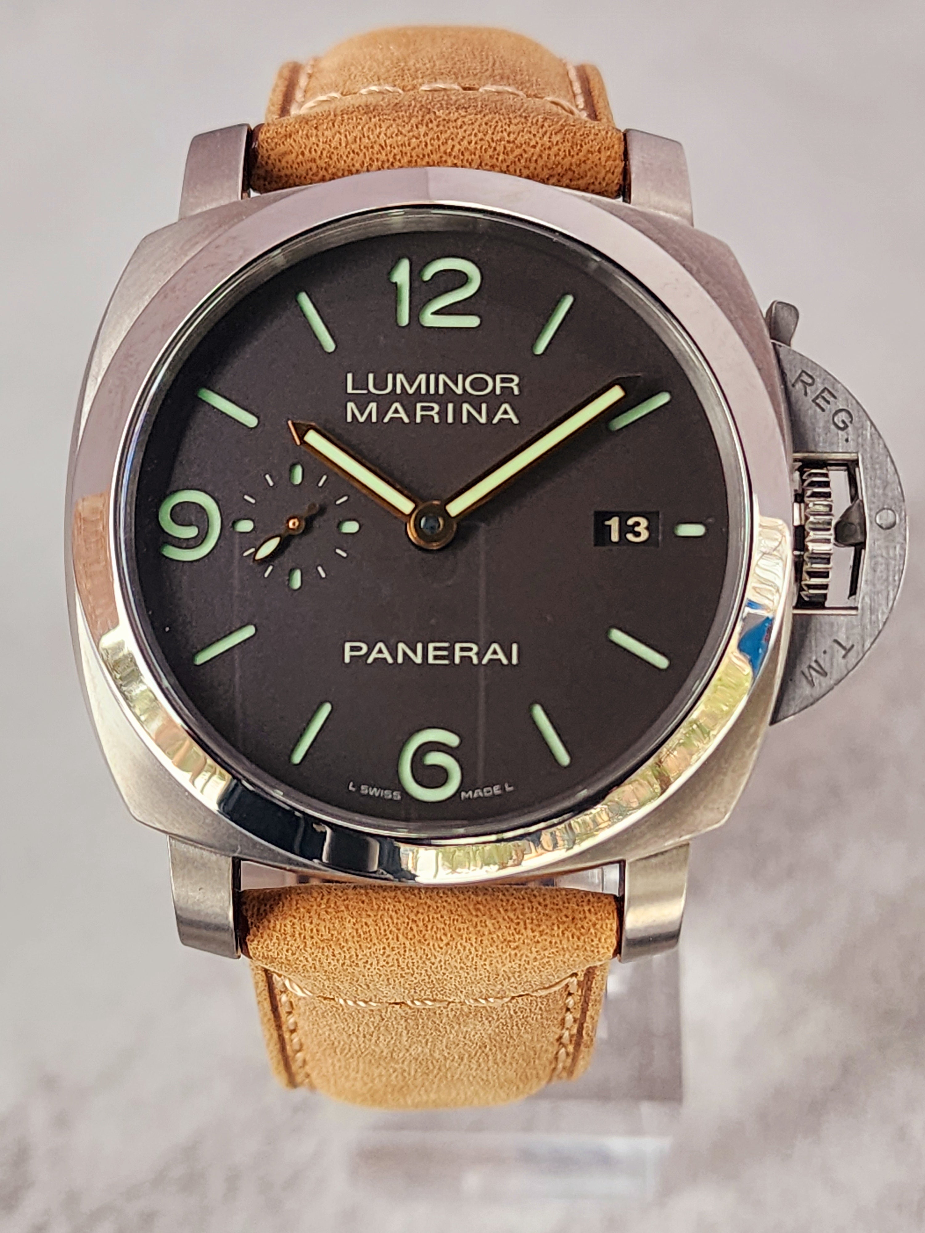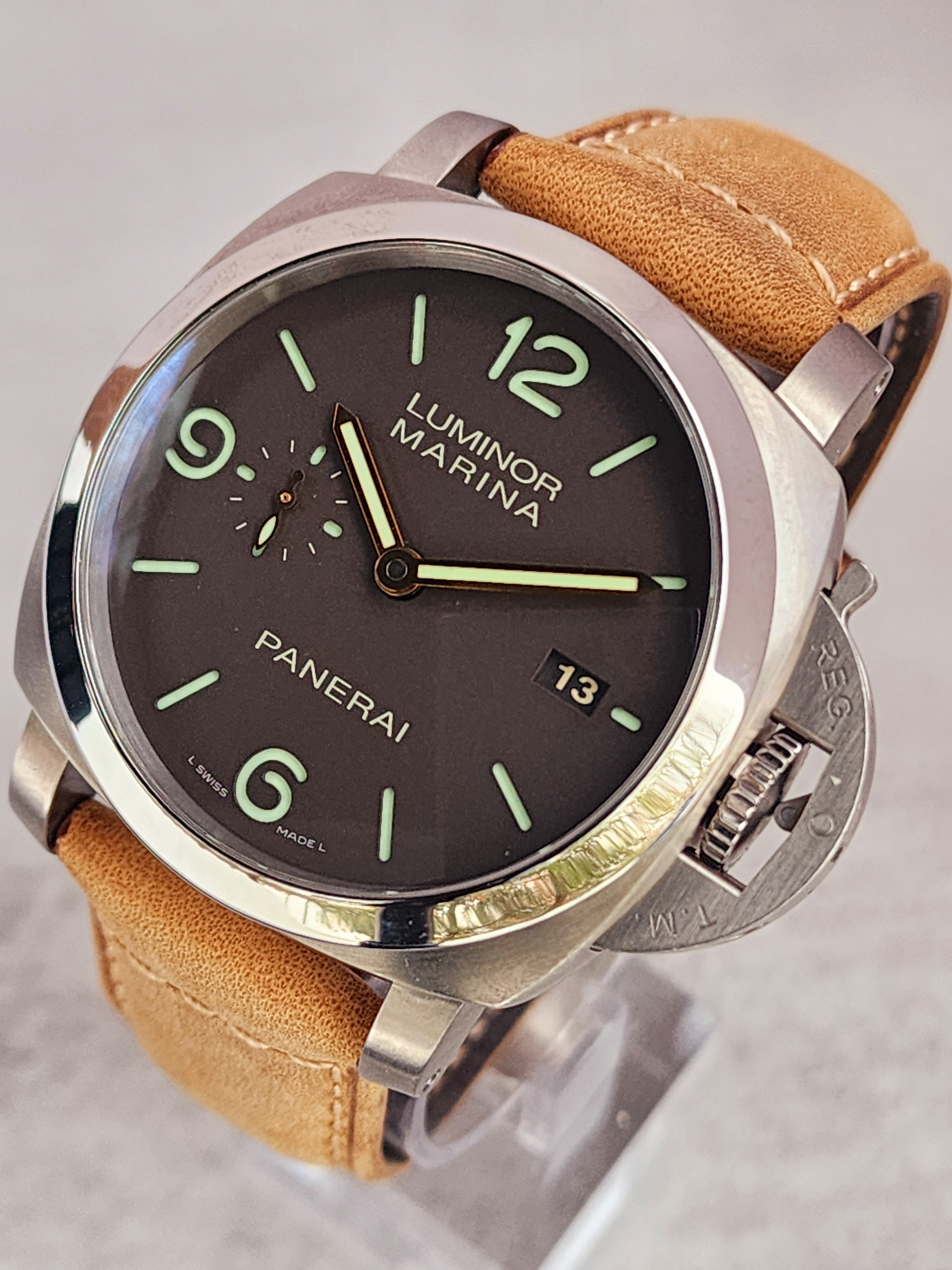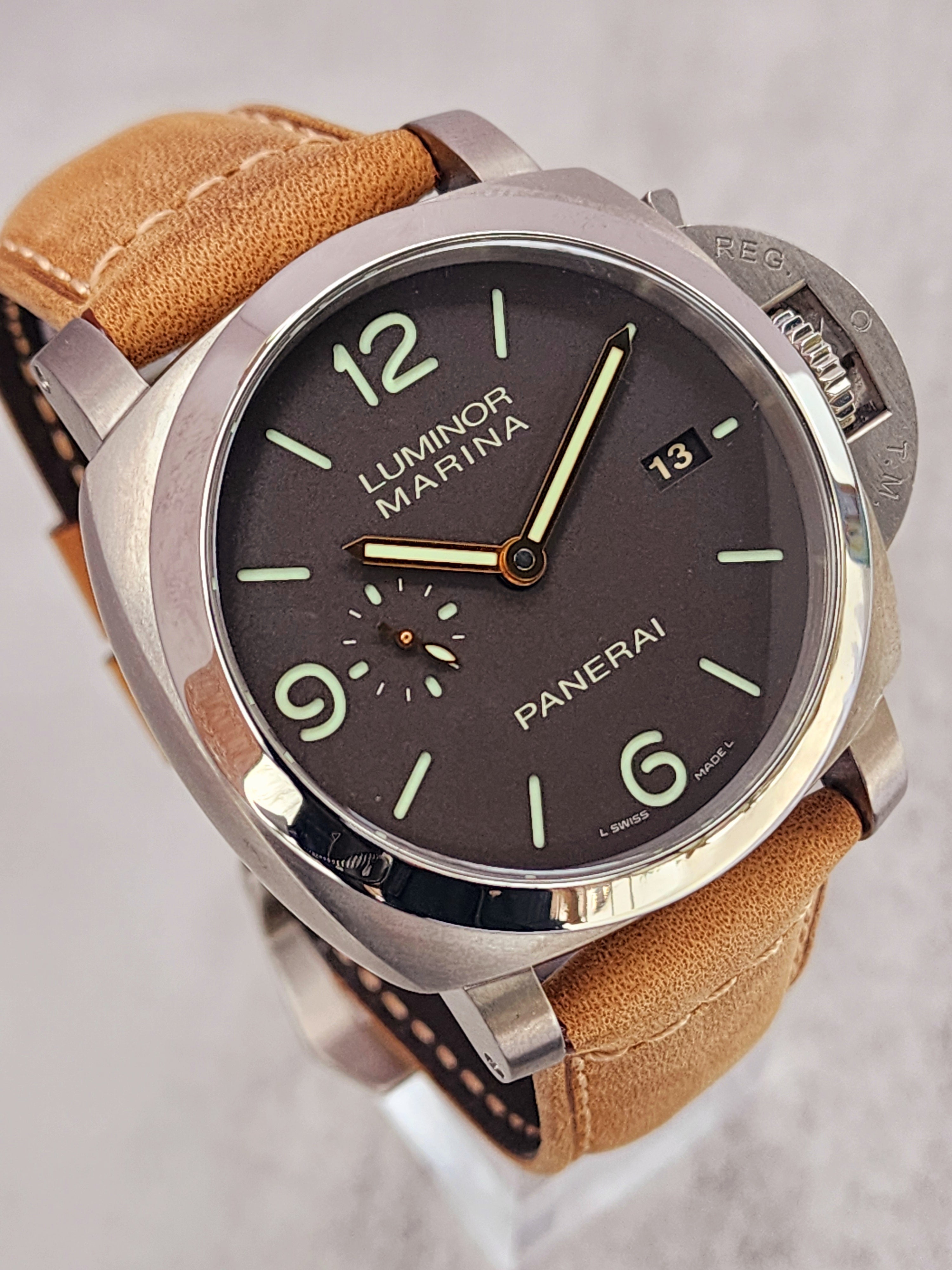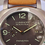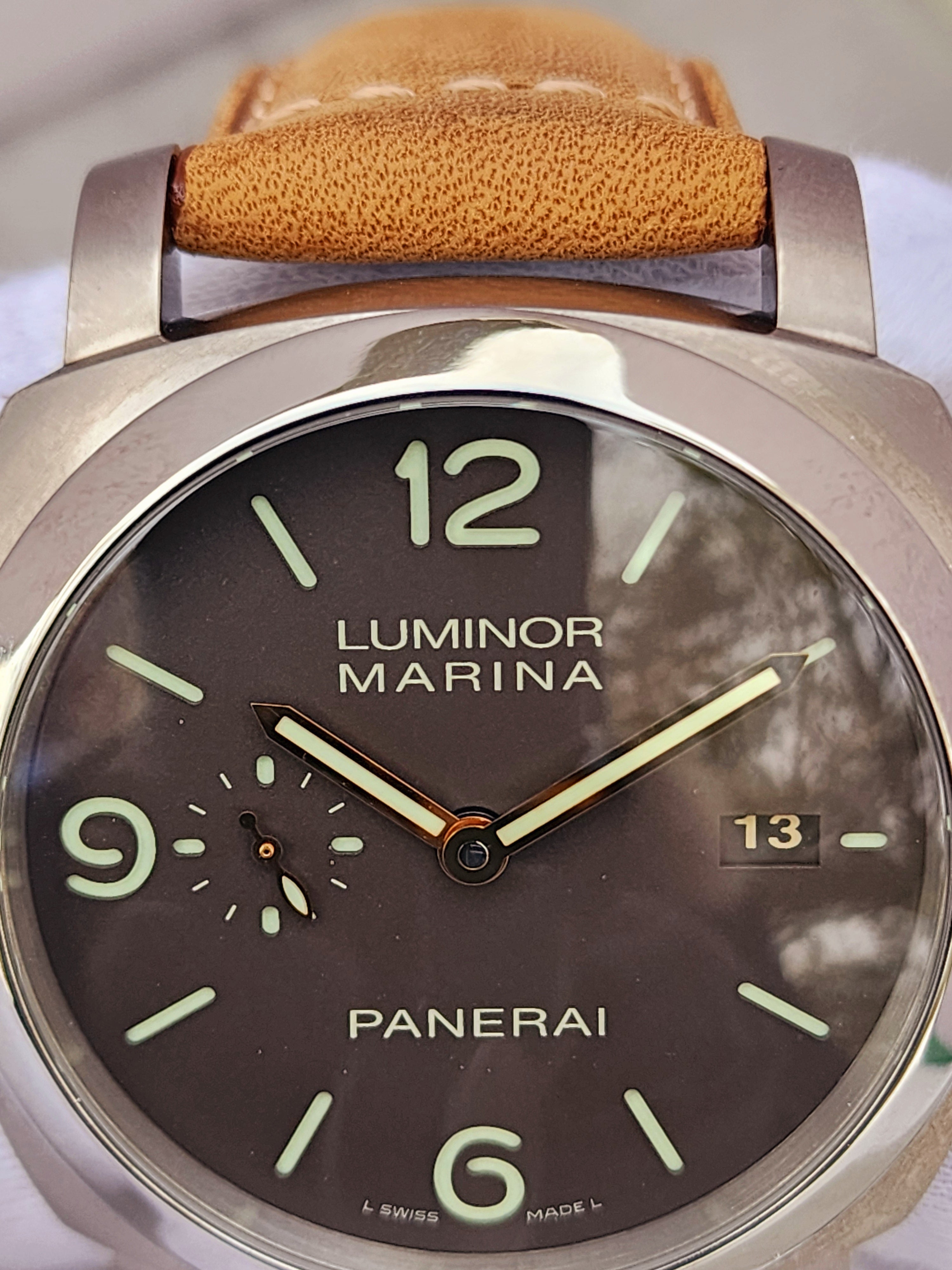 Up for sale is the Panerai Luminor Marina 1950 3 Days Automatic PAM00351 PAM351 44mm Brown Dial with Rubber Panerai strap, Straptools, double-boxed, Original purchase receipt from Panerai AD, Certificates book, Instructions book. Watch is dated 2017. It was recently placed on a timegrapher and is running well. All of our watches are photographed under high intensity light with a macro lens. Any flaws will be significantly magnified. The serial numbers have been blurred for privacy. This Timepiece is in excellent condition with no signs of wear and is located in Indiana.