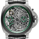 47mm sandblasted titanium case, sapphire crystal back, carbotech bezel, skelton dial, P.2005/T calibre skeleton hand-wound movement with hours, minutes, small seconds, gmt, 24h indicator, power reserve indicator on the back, tourbillon, approximately 6 days of power reserve, grey alligator strap with tone on tone stitching. Water resistant to 10 bar (~100 metres).