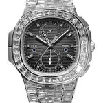 40.5 mm 18K white gold case set with diamonds, sapphire-crystal back, black gradated dial with diamond hour markers, caliber CH 28-520 C FUS self-winding movement Nautilus Travel Time Chronograph (chronograph with 60-minute counter, dual time zone mechanism indicating local and home time, local and home day/night indication in apertures, local date by hand, sweep seconds chronograph hand), approximately 45-55 hours of power reserve, 18K white gold bracelet set with diamonds, butterfly buckle. Water resistant to 120 m.