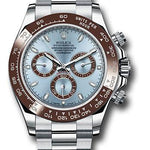 40mm 950 platinum case, chestnut brown monobloc Cerachrom bezel with engraved tachymetric scale deposited with platinum via PVD, screw-down crown and push buttons, ice blue dial with chestnut brown lacquer counters, Chromalight appliques on hands, index hour markers with Chromalight appliques, self-winding perpetual mechanical chronograph movement, folding Oysterlock bracelet with Easylink 5 mm comfort extension. Waterproof to 100 meters.