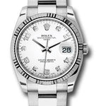 34mm Oystersteel case, screw-down crown with twinlock double waterproofness system, 18K white gold fluted bezel, scratch-resistant sapphire crystal with cyclops lens over the date and double anti-reflective coating, white dial, five diamond hour markers, Rolex calibre 3135 automatic movement, approximately 48 hours of power reserve, Oyster bracelet with flat three-piece links, folding Oysterclasp buckle with Easylink 5mm comfort extension link. Waterproof to 100 meters.