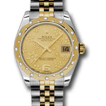 31mm stainless steel case, 18K yellow gold domed bezel set with 24 diamonds, champagne dial, floral motif, and stainless steel and 18K yellow gold Jubilee bracelet.