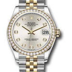 31mm yellow Rolesor case comprised of Oystersteel and 18K yellow gold, screw-down back, screw-down crown with twinlock double waterproofness system, 18K yellow gold bezel set with diamonds, scratch-resistant sapphire crystal with cyclops lens over the date, silver dial, diamond hour markers, Rolex calibre 2236 perpetual self-winding movement with date at 3 o'clock, approximately 55 hours of power reserve, yellow Rolesor Jubilee bracelet with semi-circular three-piece links, concealed folding Crownclasp buckle. Waterproof to 100 meters. Baselworld 2019 release.
