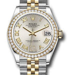 31mm yellow Rolesor case comprised of Oystersteel and 18K yellow gold, screw-down back, screw-down crown with twinlock double waterproofness system, 18K yellow gold bezel set with diamonds, scratch-resistant sapphire crystal with cyclops lens over the date, silver dial, Roman numerals with 11 diamonds set on VI, Rolex calibre 2236 perpetual self-winding movement with date at 3 o'clock, approximately 55 hours of power reserve, yellow Rolesor Jubilee bracelet with semi-circular three-piece links, concealed folding Crownclasp buckle. Waterproof to 100 meters. Baselworld 2019 release.