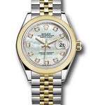 28mm yellow Rolesor case comprised of a 904L steel monobloc middle case, screw-down steel back, 18K yellow gold screw-down crown with twinlock double waterproofness system, 18K yellow gold domed bezel, scratch-resistant sapphire crystal with cyclops lens over the date and double anti-reflective coating, white mother-of-pearl dial, diamond hour markers, Rolex calibre 2236 automatic movement with center hour, minute and seconds hands, instantaneous date with rapid setting, and stop-seconds for precise time setting, yellow gold Rolesor Jubilee bracelet comprised of a combination of 904L steel and 18K yellow gold in five-piece links, concealed folding Crownclasp buckle. Waterproof to 100 meters.