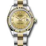 28mm yellow Rolesor case comprised of a 904L steel monobloc middle case, screw-down steel back, 18K yellow gold screw-down crown with twinlock double waterproofness system, 18K yellow gold fluted bezel, scratch-resistant sapphire crystal with cyclops lens over the date and double anti-reflective coating, champagne dial, Roman numerals, Rolex calibre 2236 automatic movement with center hour, minute and seconds hands, instantaneous date with rapid setting, and stop-seconds for precise time setting, yellow gold Rolesor Oyster bracelet comprised of a combination of 904L steel and 18K yellow gold in flat three-piece links, folding Oysterclasp buckle with Easylink 5mm comfort extension link. Waterproof to 100 meters.