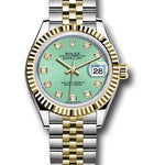 28mm yellow Rolesor case comprised of a 904L steel monobloc middle case, screw-down steel back, 18K yellow gold screw-down crown with twinlock double waterproofness system, 18K yellow gold fluted bezel, scratch-resistant sapphire crystal with cyclops lens over the date and double anti-reflective coating, mint green dial, diamond hour markers, Rolex calibre 2236 automatic movement with center hour, minute and seconds hands, instantaneous date with rapid setting, and stop-seconds for precise time setting, yellow gold Rolesor Jubilee bracelet comprised of a combination of 904L steel and 18K yellow gold in five-piece links, concealed folding Crownclasp buckle. Waterproof to 100 meters.