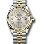 28mm yellow Rolesor case comprised of a 904L steel monobloc middle case, screw-down steel back, 18K yellow gold screw-down crown with twinlock double waterproofness system, 18K yellow gold fluted bezel, scratch-resistant sapphire crystal with cyclops lens over the date and double anti-reflective coating, silver dial, Roman numerals, Rolex calibre 2236 automatic movement with center hour, minute and seconds hands, instantaneous date with rapid setting, and stop-seconds for precise time setting, yellow gold Rolesor Jubilee bracelet comprised of a combination of 904L steel and 18K yellow gold in five-piece links, concealed folding Crownclasp buckle. Waterproof to 100 meters.