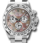 40mm 18K white gold case, tachymeter engraved bezel, screw-down push buttons, dark mother of pearl dial, white mother of pearl subdials, 8 diamond hour markers, and special Oysterlock bracelet.