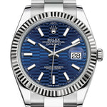 41mm white Rolesor case comprised of Oystersteel and white gold, screw-down back, screw-down crown with twinlock double waterproofness system, fluted bezel, scratch-resistant sapphire crystal with cyclops lens over the date, bright blue fluted motif dial, index hour markers, Rolex calibre 3235 perpetual self-winding movement with centre hour, minute and seconds hands, instantaneous date with rapid setting, and stop-seconds for precise time setting, approximately 70 hours of power reserve, Oyster bracelet with flat three-piece links, folding Oysterclasp buckle with Easylink 5mm comfort extension link. Waterproof to 100 metres / 330 feet.