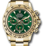 40mm 18K yellow gold case, screw-down back, screw-down crown and push buttons with Triplock triple waterproofness, fixed 18K yellow gold bezel with engraved tachymetric scale, scratch-resistant sapphire crystal, green dial, Arabic numerals, Rolex calibre 4130 self-winding movement with chronograph central second hand, 30-minute counter at 3 o'clock, and 12-hour counter at 9 o'clock, approximately 72 hours of power reserve, 18K yellow gold Oyster bracelet with flat three-piece links, folding Oysterlock buckle with Easylink 5mm comfort extension link. Waterproof to 100 meters.