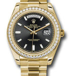 40mm 18K yellow gold case, screw-down back with Rolex fluting, screw-down crown with twinlock double waterproofness system, bezel set with 48 diamonds, scratch-resistant double anti-reflective sapphire crystal with cyclops lens over the date, black dial, 10 baguette diamond hour markers, Rolex calibre 3255 automatic movement with centre hour, minute and seconds hands, instantaneous day and date in apertures, unrestricted rapid-setting, and stop-seconds for precise time setting, approximately 70 hours of power reserve, President bracelet with three-piece solid links comprised of a polished center link, satin-finished outer links, and ceramic inserts, concealed folding Crownclasp buckle. Waterproof to 100 meters.