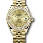 28mm 18K yellow gold oyster case, screw-down crown with twinlock double waterproofness system, bezel set with 44 diamonds, scratch-resistant sapphire crystal with cyclops lens over the date and double anti-reflective coating, champagne dial, Roman numerals, Rolex calibre 2236 automatic movement with center hour, minute and seconds hands, instantaneous date with rapid setting, and stop-seconds for precise time setting, 18K yellow gold Jubilee bracelet with five-piece links, concealed folding Crownclasp buckle. Waterproof to 100 meters.