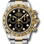 40mm Yellow Rolesor case with 904L steel monobloc middle case, screw-down steel back, screw-down crown and push buttons with Triplock triple waterproofness, fixed 18K yellow gold bezel with engraved tachymetric scale, scratch-resistant sapphire crystal, black dial, diamond hour markers, Rolex calibre 4130 self-winding movement with chronograph central second hand, 30-minute counter at 3 o'clock, and 12-hour counter at 9 o'clock, approximately 72 hours of power reserve, 18K yellow gold Oyster bracelet with flat three-piece links made from a combination of 904L steel and 18K yellow gold, folding Oysterlock buckle with Easylink 5mm comfort extension link. Waterproof to 100 meters.