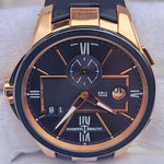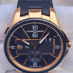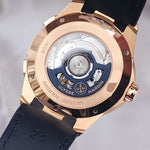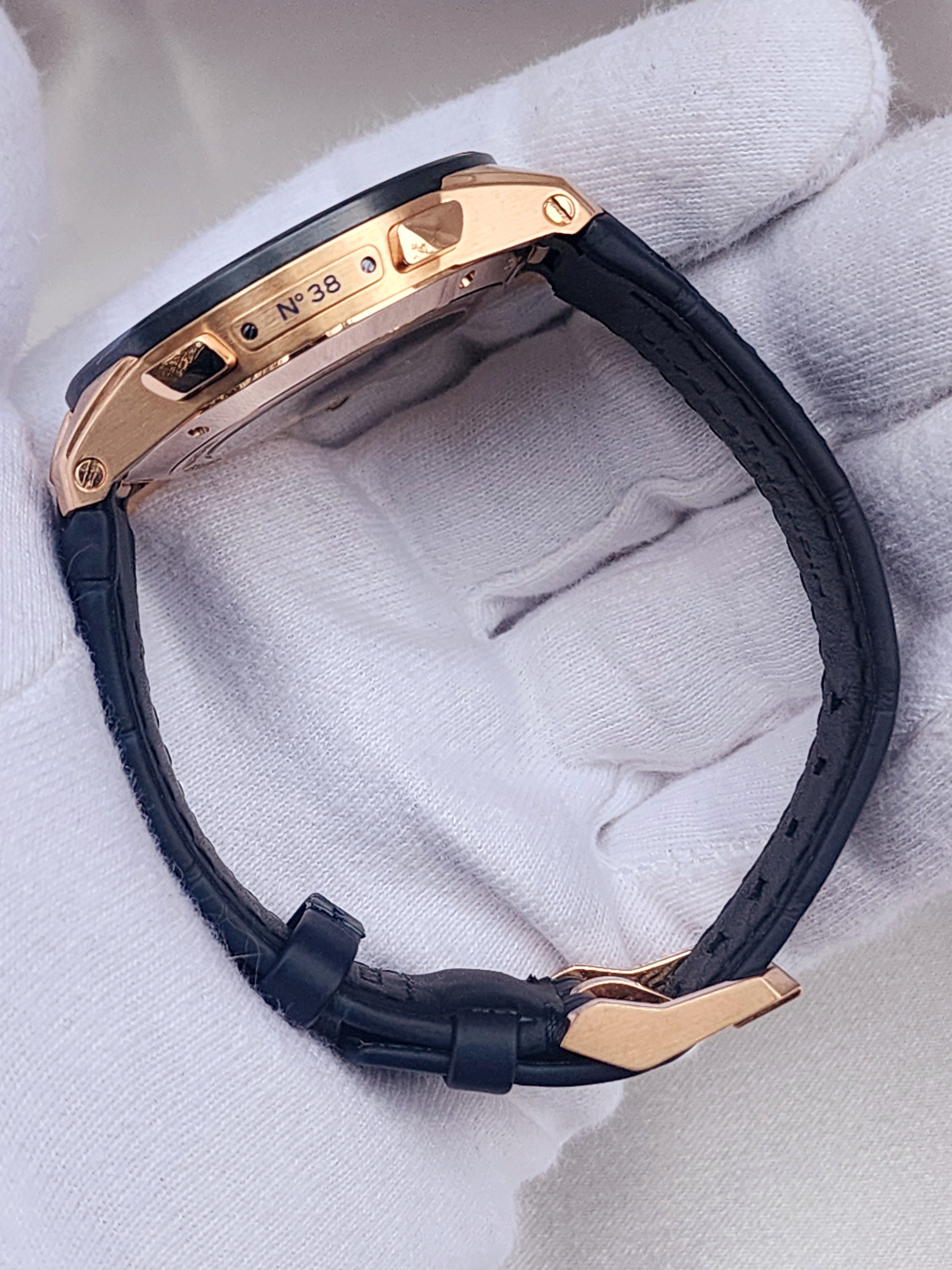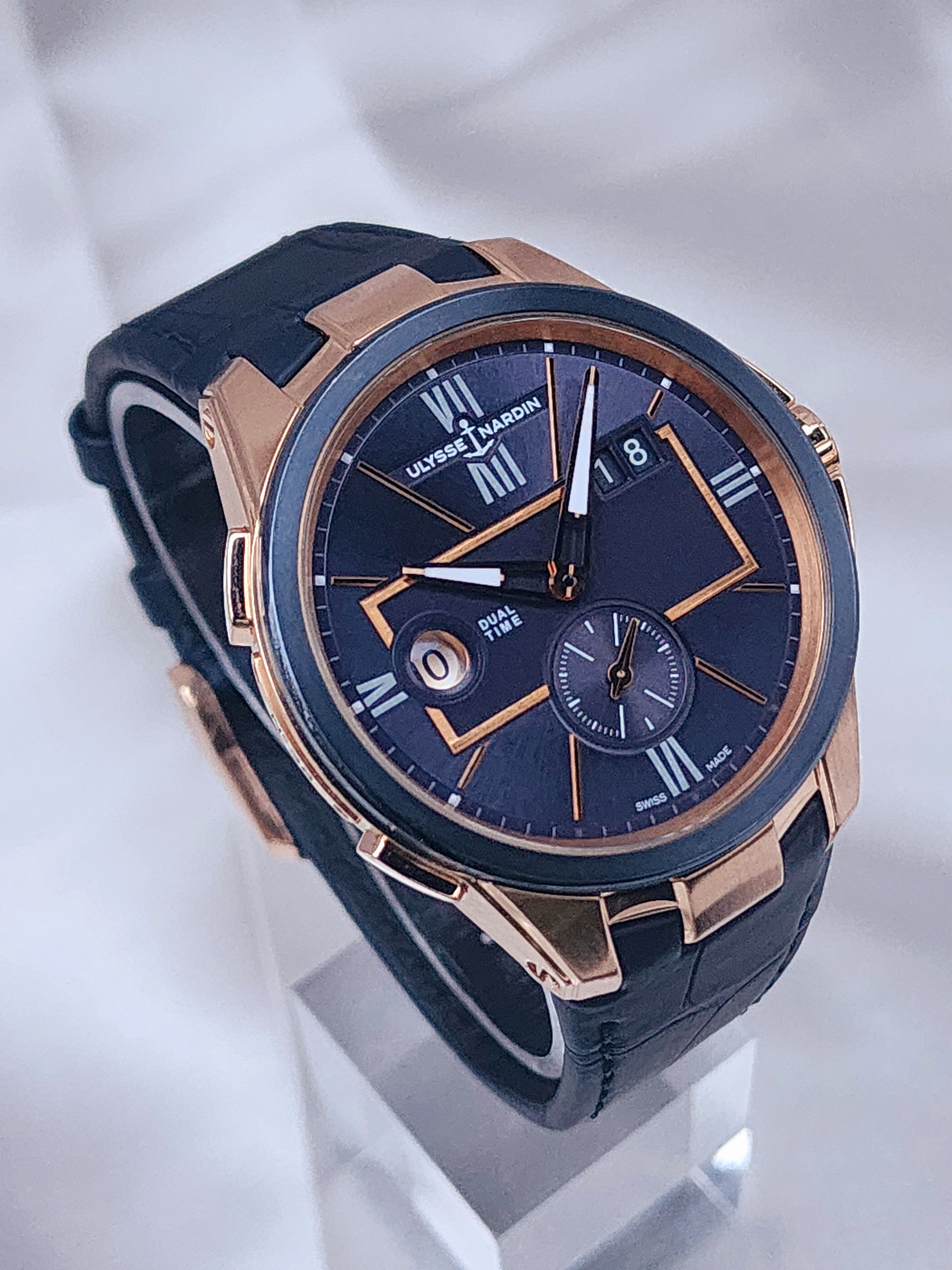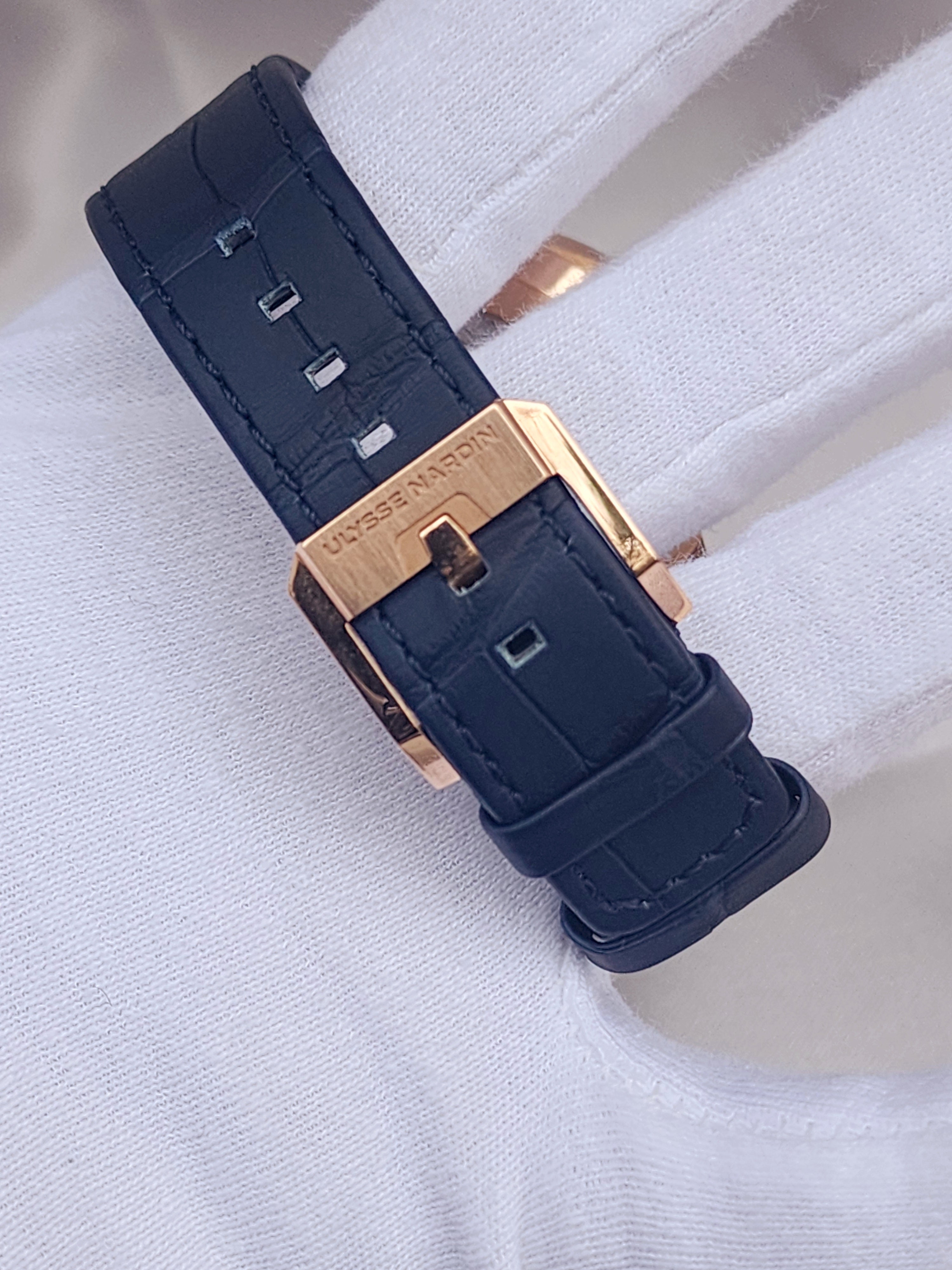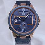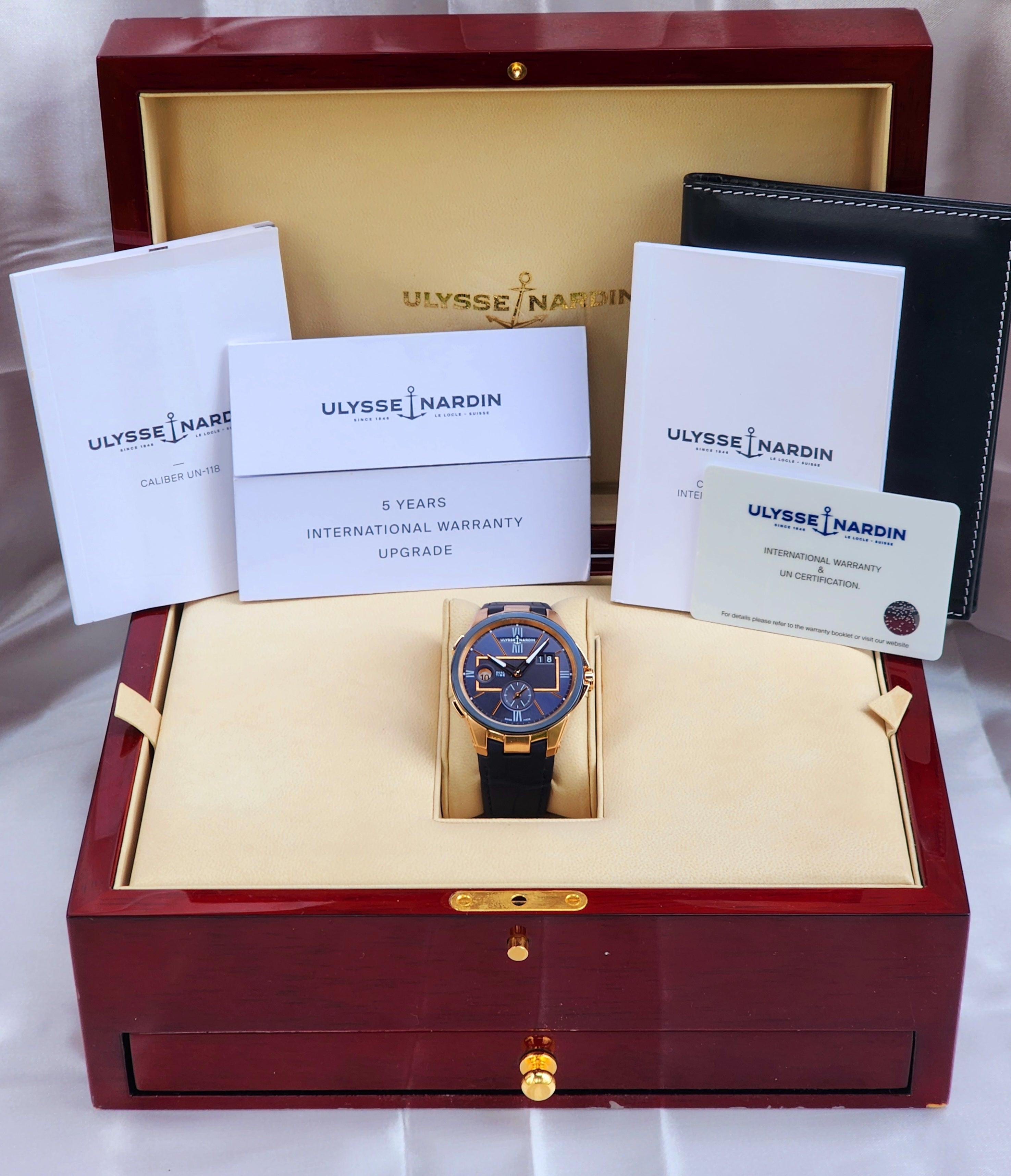Up for sale is the Ulysse Nardin Blast Dual Time Rose Gold 242-20-3/43 42mm Blue Gold Dial with warranty card, double boxed, caliber un-24 book and customer service international warranty. Watch is dated 2024. MSRP $22300. It was recently placed on a timegrapher and is running well. All of our watches are photographed under high intensity light with a macro lens. Any flaws will be significantly magnified. The serial numbers have been blurred for privacy. Timepiece is in excellent condition with little to no signs of wear and a very minor blemish on the bezel at 11 and is located in Indiana.