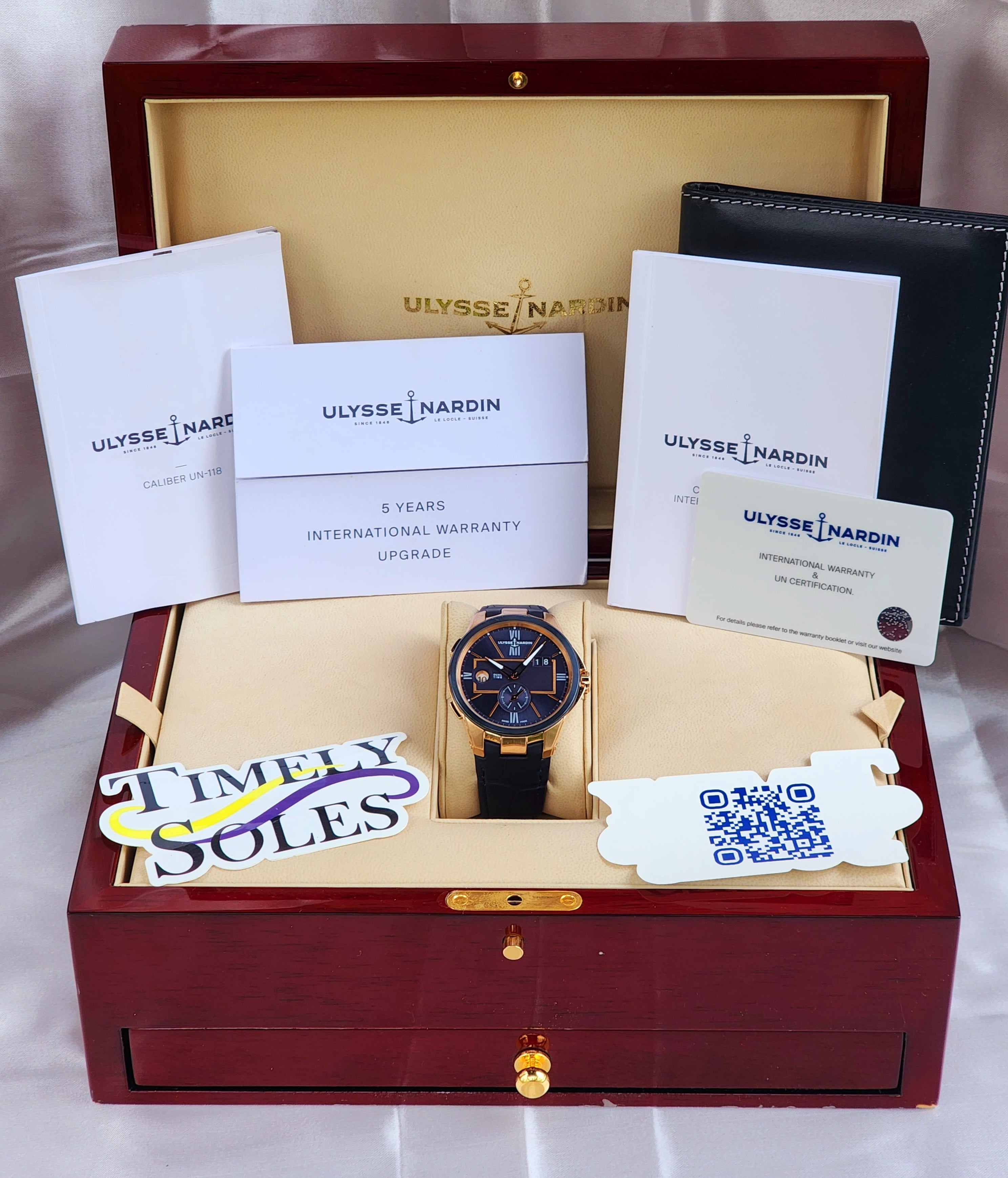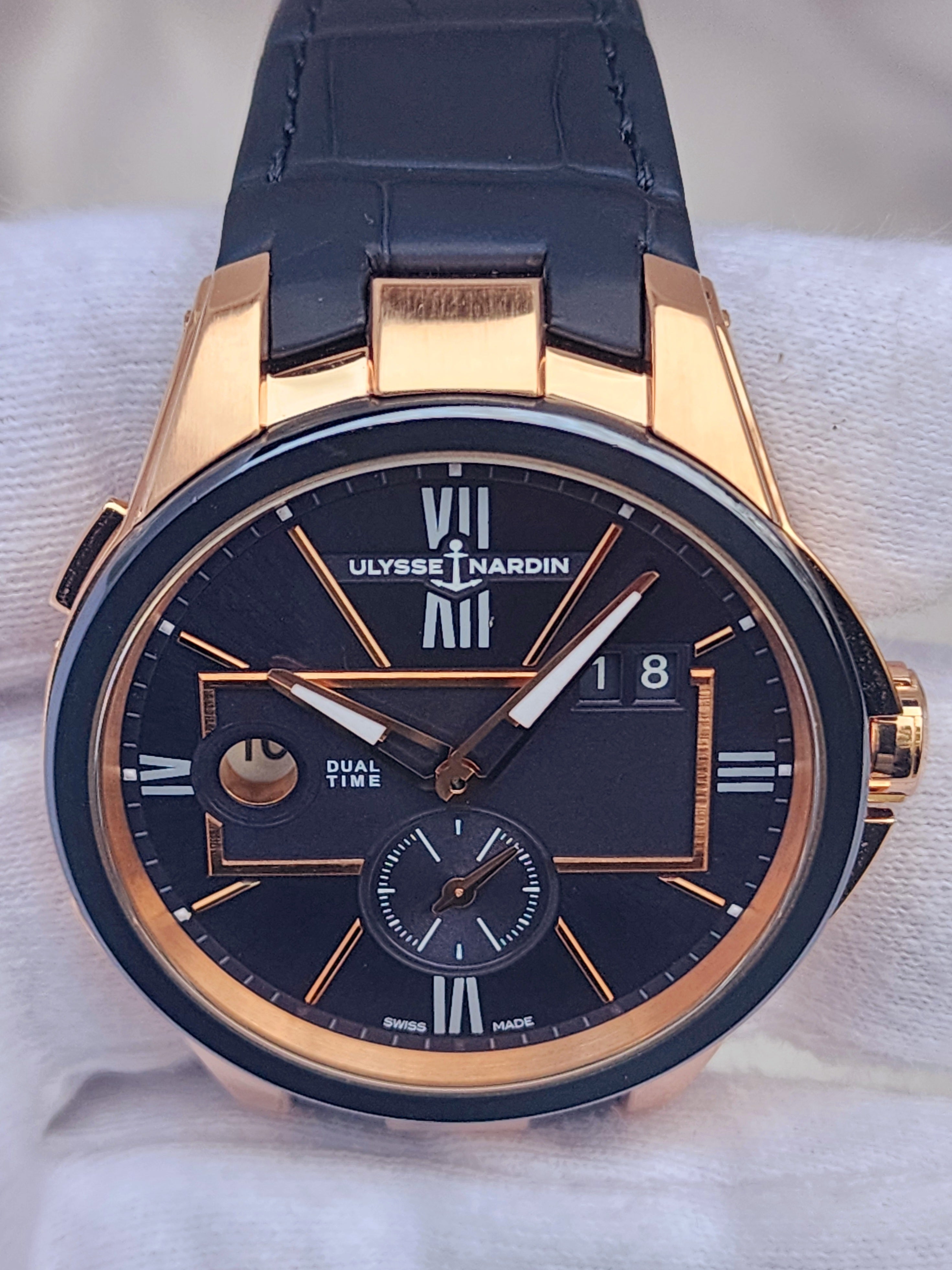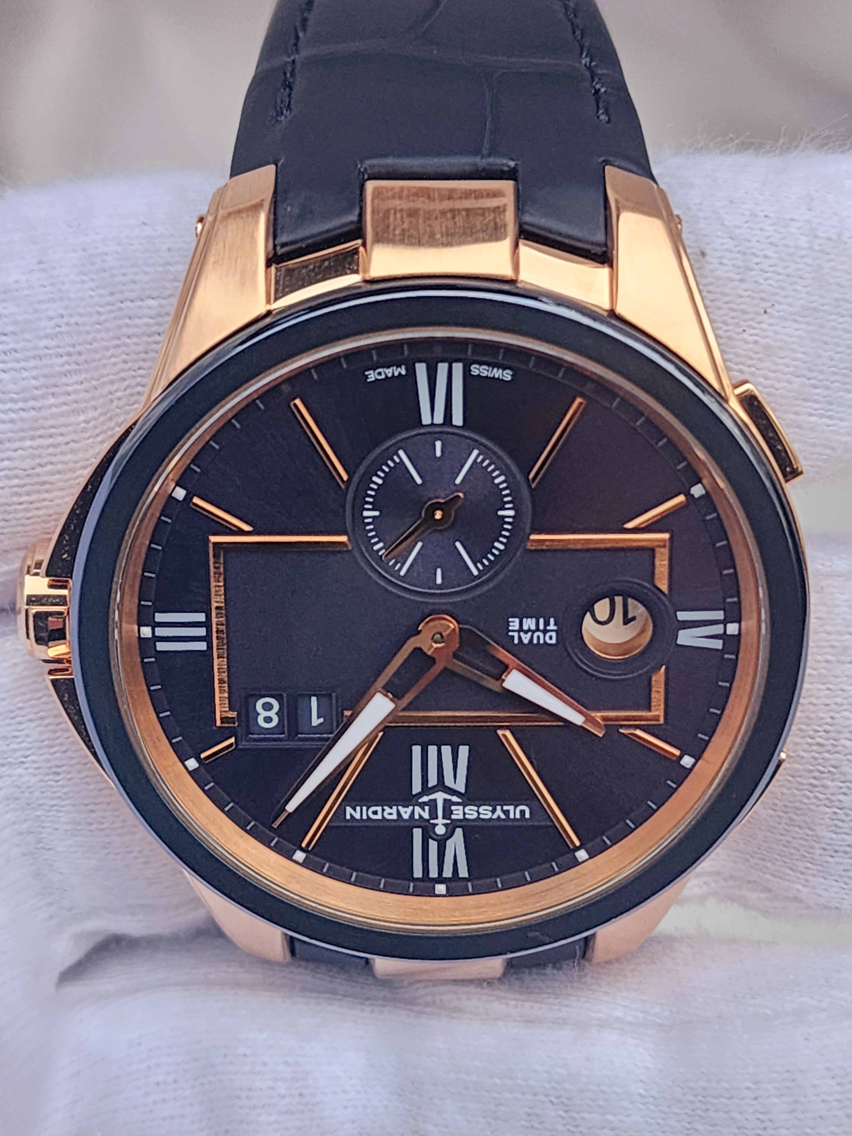 Up for sale is the Ulysse Nardin Blast Dual Time  Rose Gold 242-20-3/43 42mm Blue Gold Dial with warranty card, double boxed, caliber un-24 book and customer service international warranty. Watch is dated 2024. MSRP $22300. It was recently placed on a timegrapher and is running well. All of our watches are photographed under high intensity light with a macro lens. Any flaws will be significantly magnified. The serial numbers have been blurred for privacy. Timepiece is in excellent condition with little to no signs of wear and a very minor blemish on the bezel at 11 and is located in Indiana.