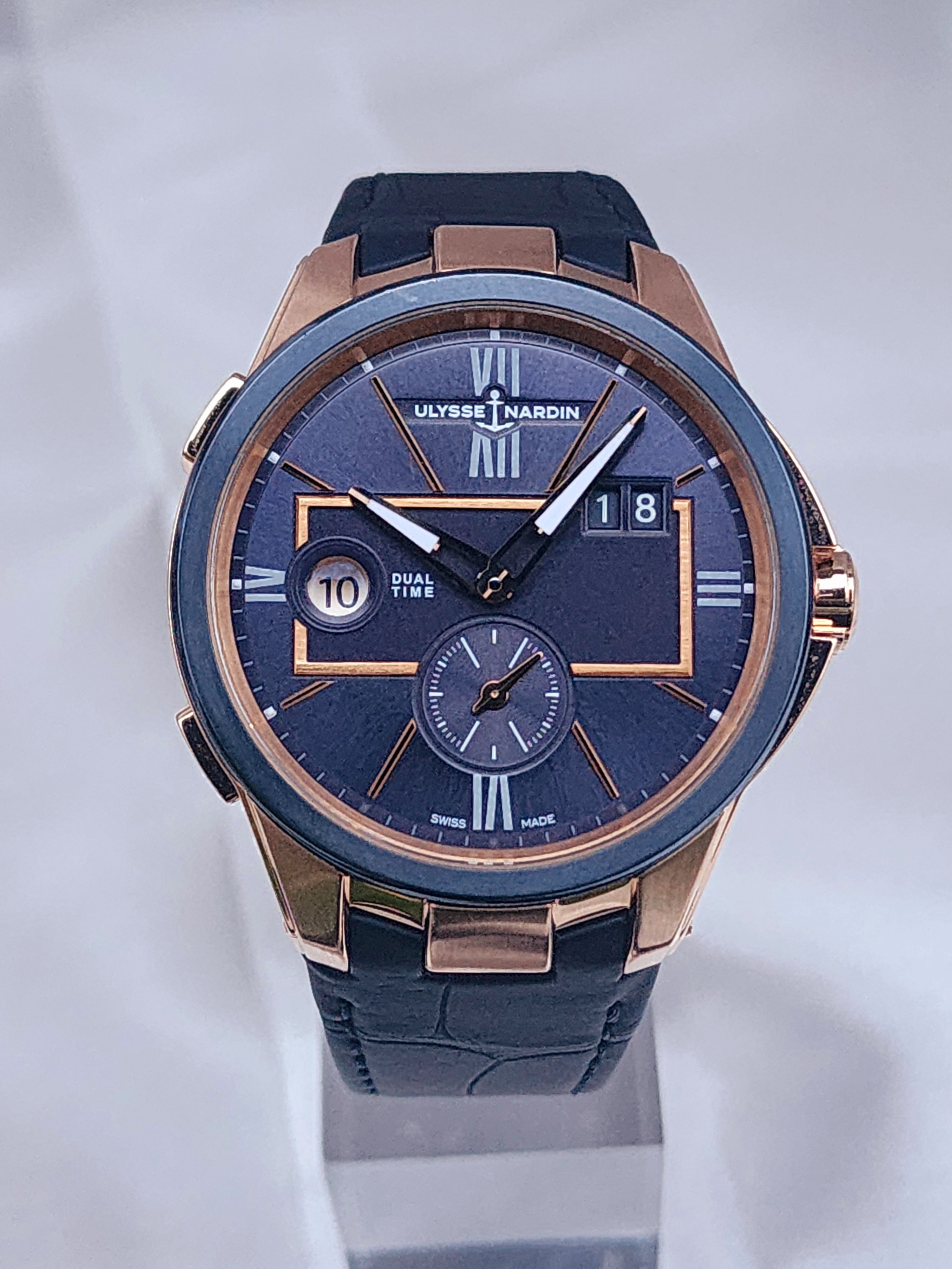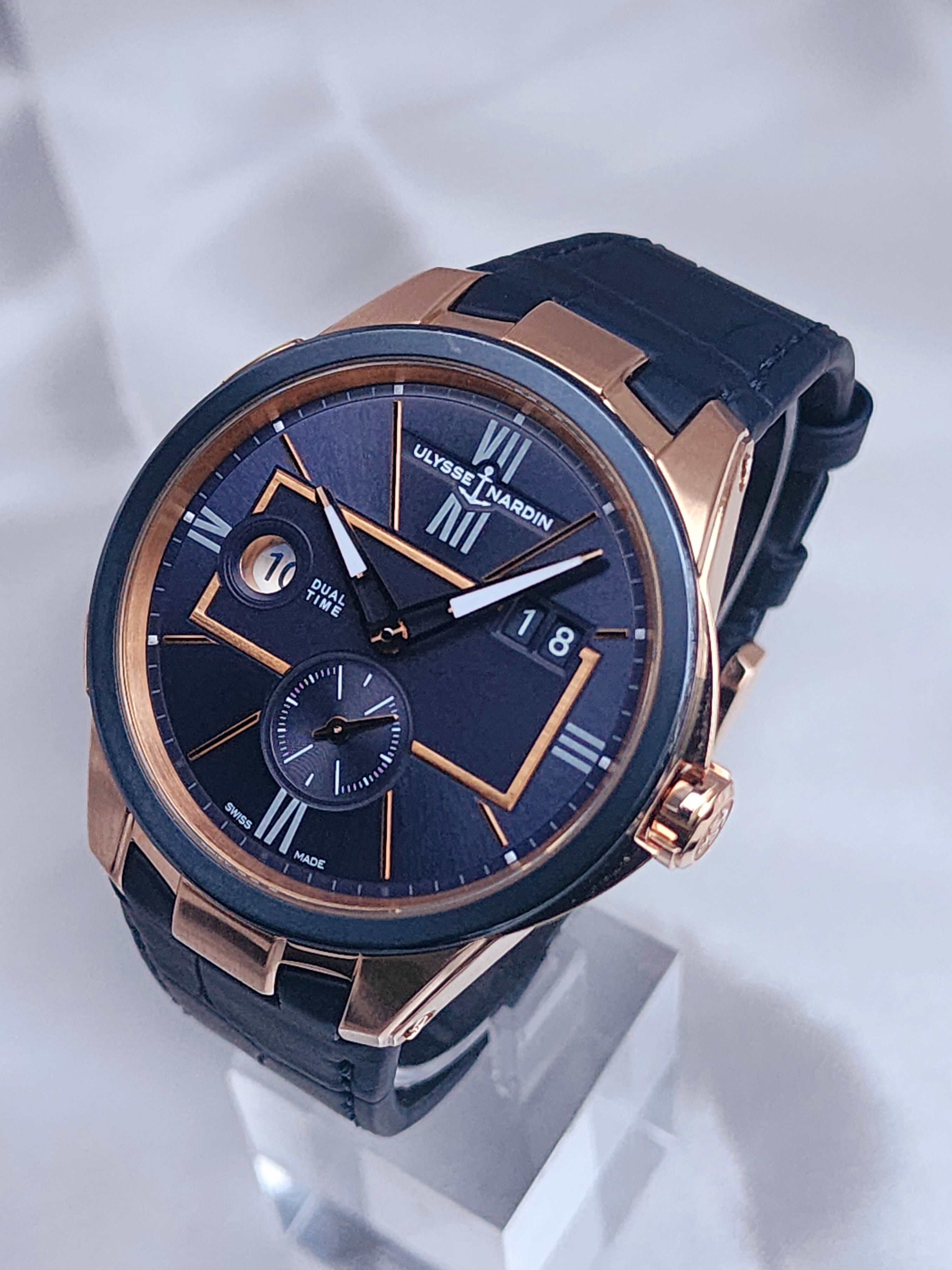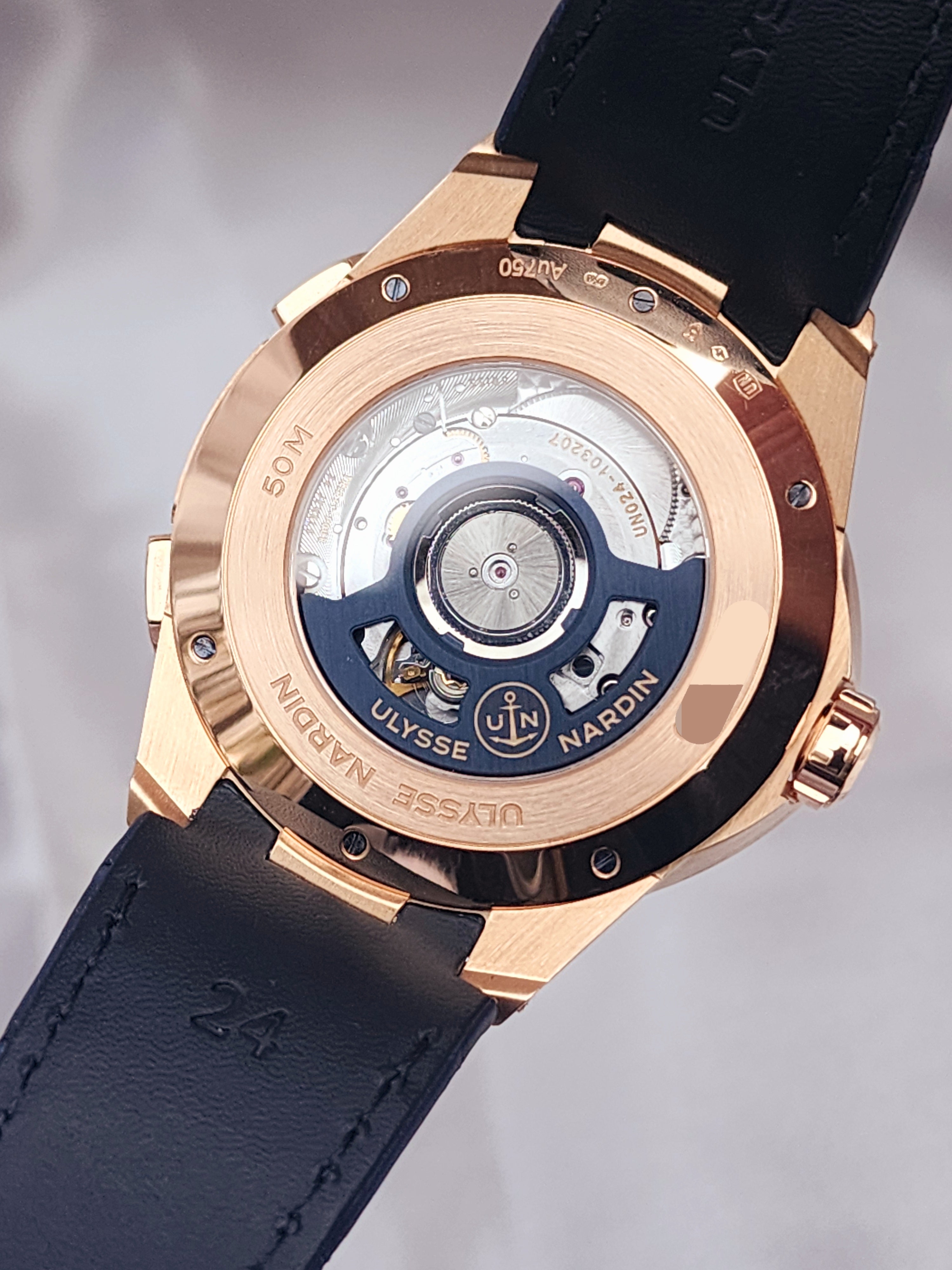 Up for sale is the Ulysse Nardin Blast Dual Time  Rose Gold 242-20-3/43 42mm Blue Gold Dial with warranty card, double boxed, caliber un-24 book and customer service international warranty. Watch is dated 2024. MSRP $22300. It was recently placed on a timegrapher and is running well. All of our watches are photographed under high intensity light with a macro lens. Any flaws will be significantly magnified. The serial numbers have been blurred for privacy. Timepiece is in excellent condition with little to no signs of wear and a very minor blemish on the bezel at 11 and is located in Indiana.