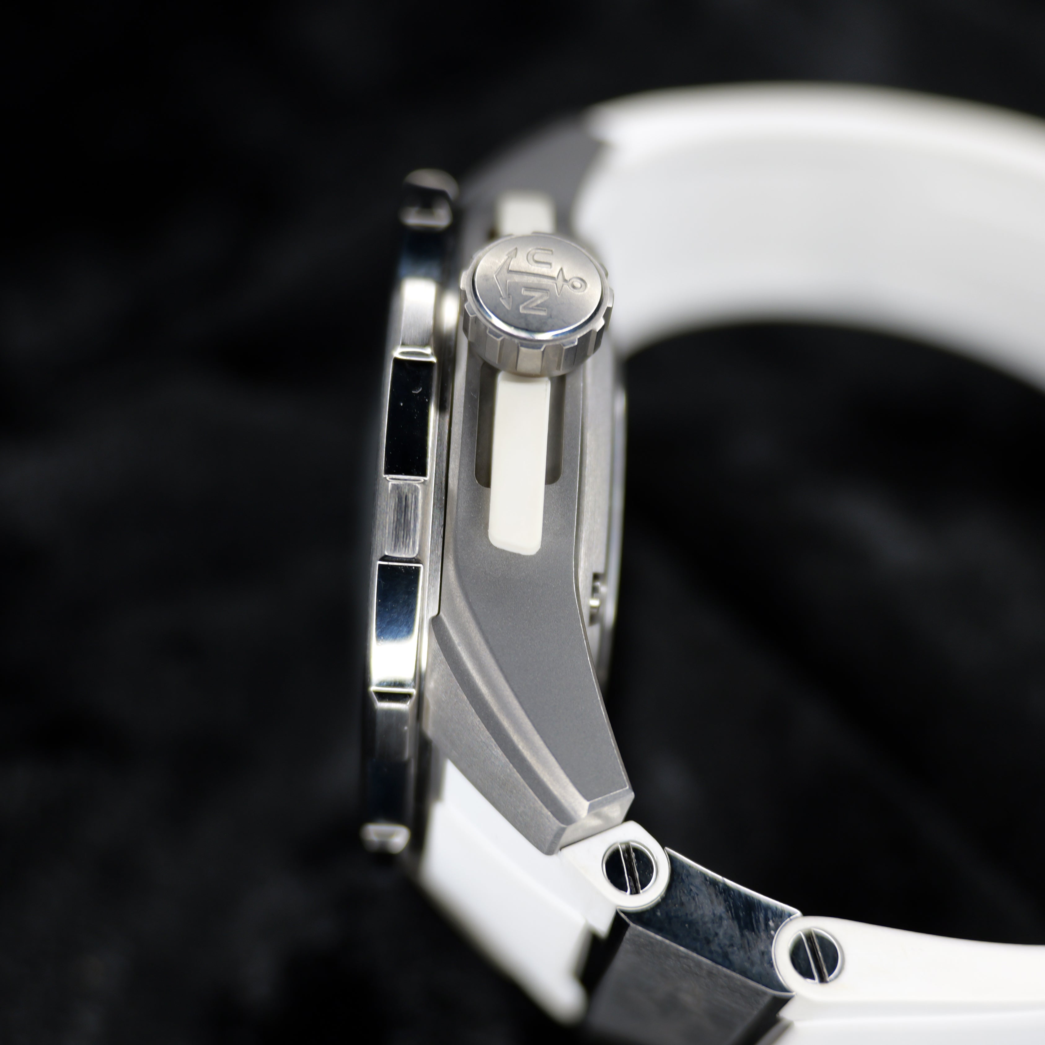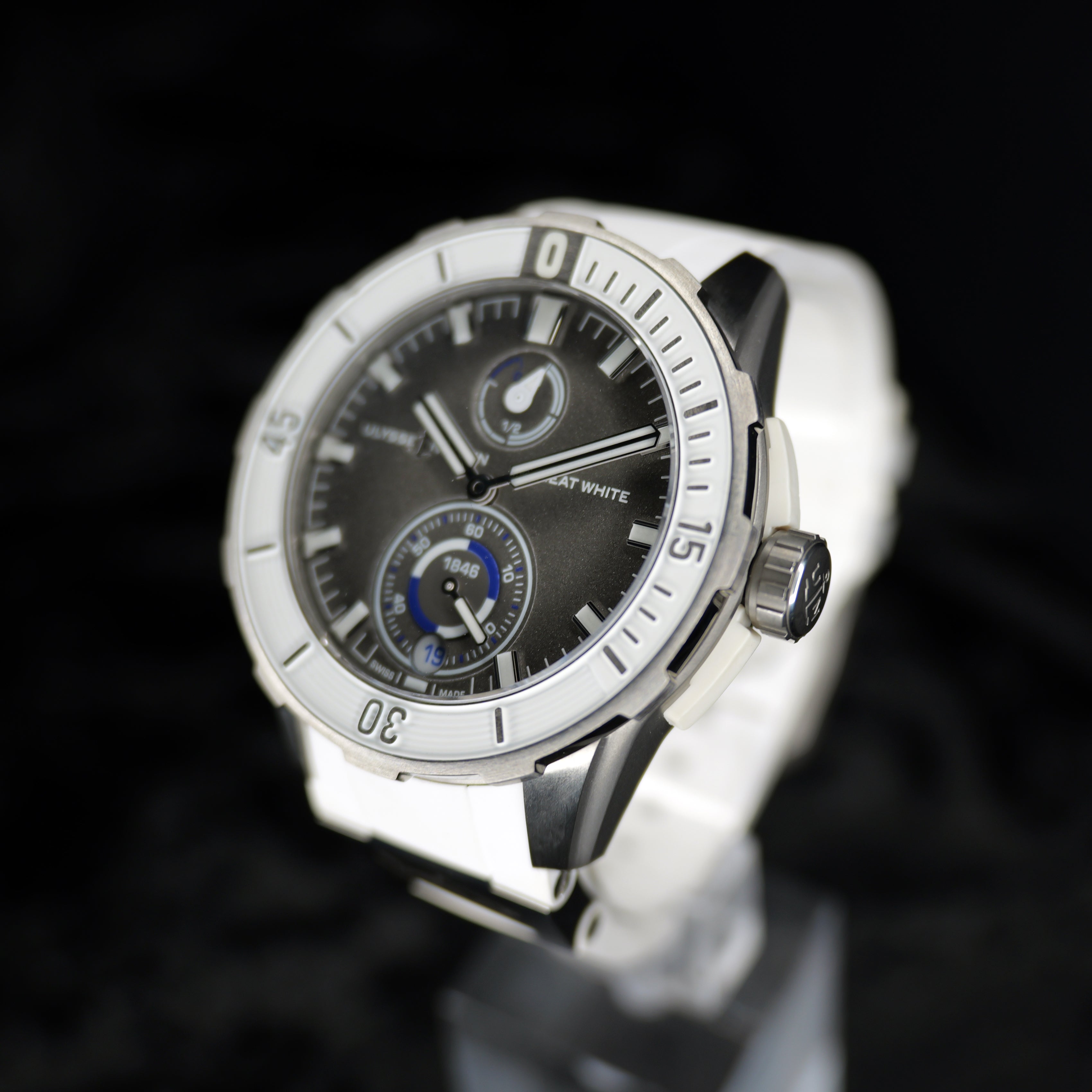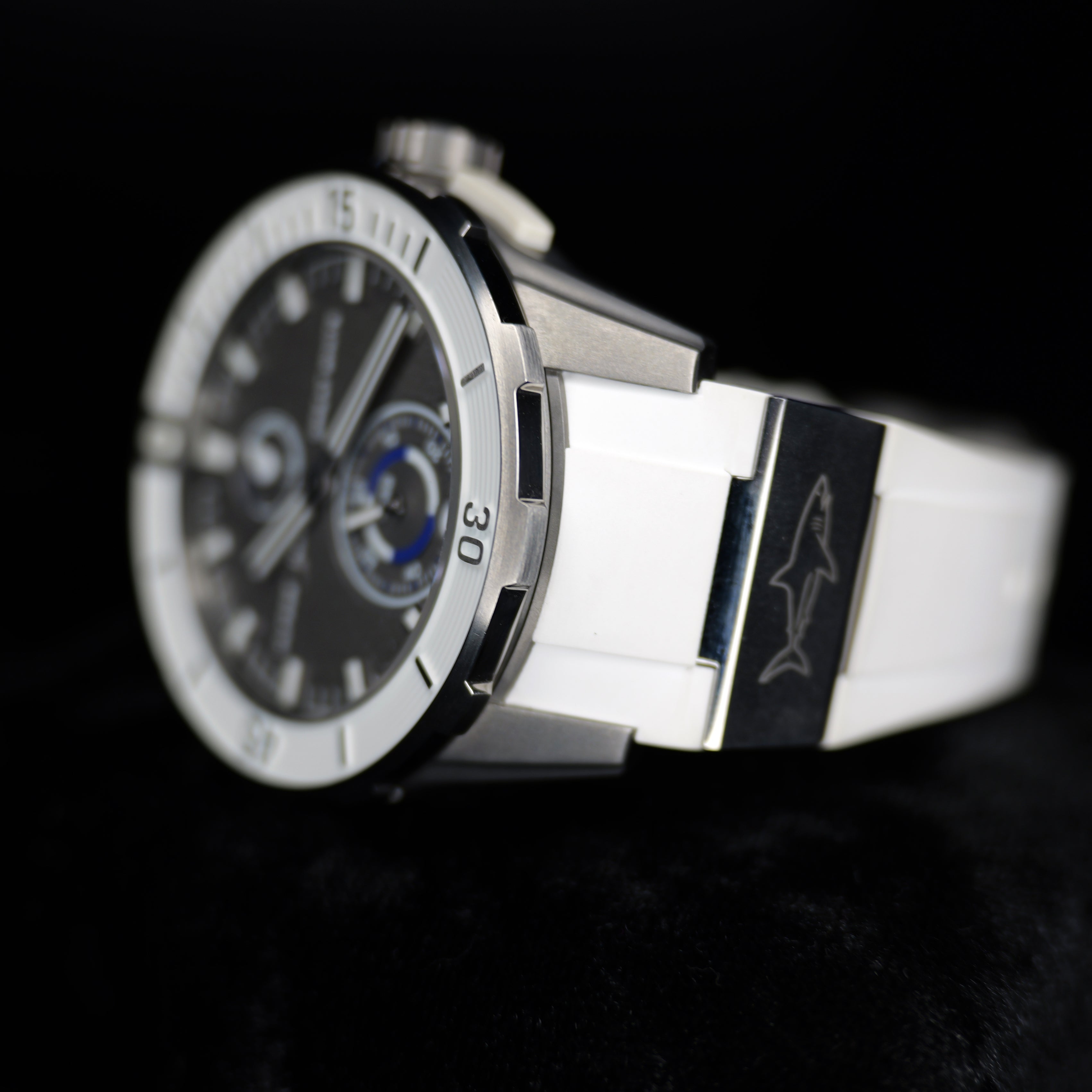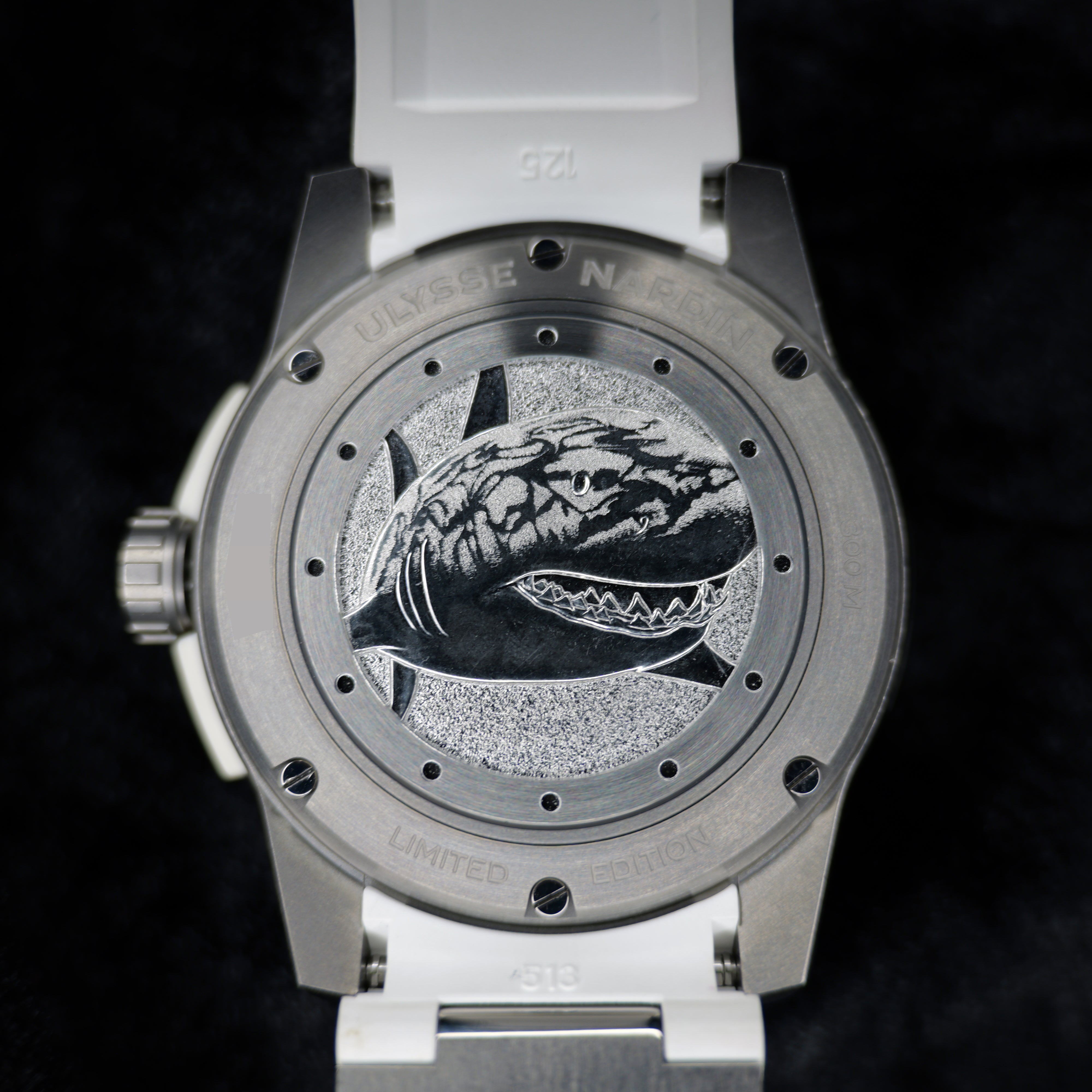 Up for sale is the Ulysse Nardin Diver Chronometer Great White Limited Edition 1183-170LE-3/90-GW 44MM Titanium Grey Dial. MSRP $10,000. It was recently placed on a timegrapher and is running well. All of our watches are photographed under high intensity light with a macro lens. Any flaws will be significantly magnified. The serial numbers have been blurred for privacy. Timepiece is in excellent condition showing little to no signs of wear. Timepiece is located in Indiana.
