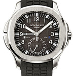 40.8 mm stainless steel case, sapphire-crystal back, black embossed dial with gold applied numerals and luminescent hour markers, caliber 324 S C FUS self-winding movement with Aquanaut Travel Time dual time zone mechanism indicating local and home time, local and home day/night indication in apertures, local date by hand, sweep seconds hand, approximately 35-45 hours of power reserve, black Tropical composite strap, Aquanaut fold-over buckle. Water resistant to 120 m.