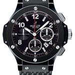 44mm black ceramic case, black ceramic bezel, black dial, self winding HUB 44 movement with chronograph function, approximately 42 hours of power reserve, black rubber strap with deployant buckle. Water resistant to 100 meters.