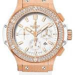 44mm 18K red gold case, 18K red gold bezel set with 114 diamonds (1.78 ct), white composite resin lateral inserts and bezel lugs, white dial, self winding HUB 4100 movement with chronograph function, approximately 42 hours of power reserve, white rubber strap with deployant buckle. Water resistant to 100 meters.