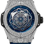 45 mm satin-finished and polished titanium case set with 180 diamonds in engraved design by Maxime Buchi, satin-finished and polished titanium bezel with 6 H-shaped titanium screws and set with 96 diamonds in hexagonal decor designed by Maxime Buchi, sapphire crystal with anti-reflective treatment, mat and satin-finished blue dial, HUB1213 self-winding movement, approximately 72 hours of power reserve, black rubber and blue calf leather strap with embossed design by Maxime Buchi, titanium deployant buckle. Water resistant to 100 meters.
