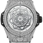 45 mm satin-finished and polished titanium case set with 180 diamonds in engraved design by Maxime Buchi, satin-finished and polished titanium bezel with 6 H-shaped titanium screws and set with 96 diamonds in hexagonal decor designed by Maxime Buchi, sapphire crystal with anti-reflective treatment, mat white dial, HUB1213 self-winding movement, approximately 72 hours of power reserve, black rubber and white calf leather strap with embossed design by Maxime Buchi, titanium deployant buckle. Water resistant to 100 meters.