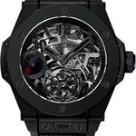 45 mm microblasted black ceramic case, microblasted black ceramic bezel, sapphire crystal with anti-reflective treatment, sapphire dial with black luminescent on hands, HUB6016 manufacture manual-winding movement with power reserver skeleton tourbillon, approximately 115 hours of power reserve, black structured lined rubber strap, black-plated titanium deployant buckle. Water resistant to 30 meters.