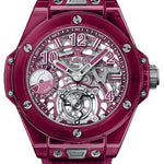 45 mm polished red sapphire crystal case, polished red sapphire crystal bezel, sapphire crystal with anti-reflective treatment, sapphire crystal dial, HUB6016 movement, approximately 115 hours of power reserve, red transparent structured lined rubber strap, titanium deployant buckle. Water resistant to 30m (3 ATM).
