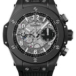 42 mm microblasted and polished black ceramic case, microblasted and polished black ceramic bezel with 6 H-shaped titanium screws, sapphire crystal with anti-reflective treatment, matte black skeleton dial, HUB1280 UNICO manufacture self-winding chronograph flyback movement, approximately 72 hours of power reserve, black structured rubber strap, black ceramic and black-plated titanium deployant buckle. Water resistant to 100m (10 ATM).