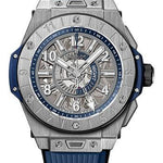 45 mm satin finished and polished titanium case, 15.85 mm thick, satin-finished and polished titanium with engraved dual time, blue composite resin lower bezel bezel with 6 H-shaped titanium screws, sapphire crystal with anti-reflective treatment, blue skeleton dial, HUB 1251 Unico self-winding movement, approximately 72 hours of power reserve, blue structured lined rubber strap, titanium deployant buckle. Water resistant to 100 meters.