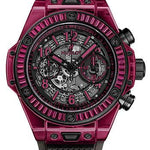 45 mm polished red sapphire crystal case, polished black-plated bezel set with 48 baguette-cut rubies with 6H-shaped black-plated titanium screws, sapphire crystal with anti-reflective treatment, polished and smoked transparent composite resin skeleton dial with red luminescent appliques, HUB1242 UNICO self-winding movement with flyback chronograph and column wheel, approximately 72 hours of power reserve, black smoked transparent structured lined straps structured lined rubber strap, black ceramic and black-plated titanium deployant buckle. Water resistant to 100 meters.